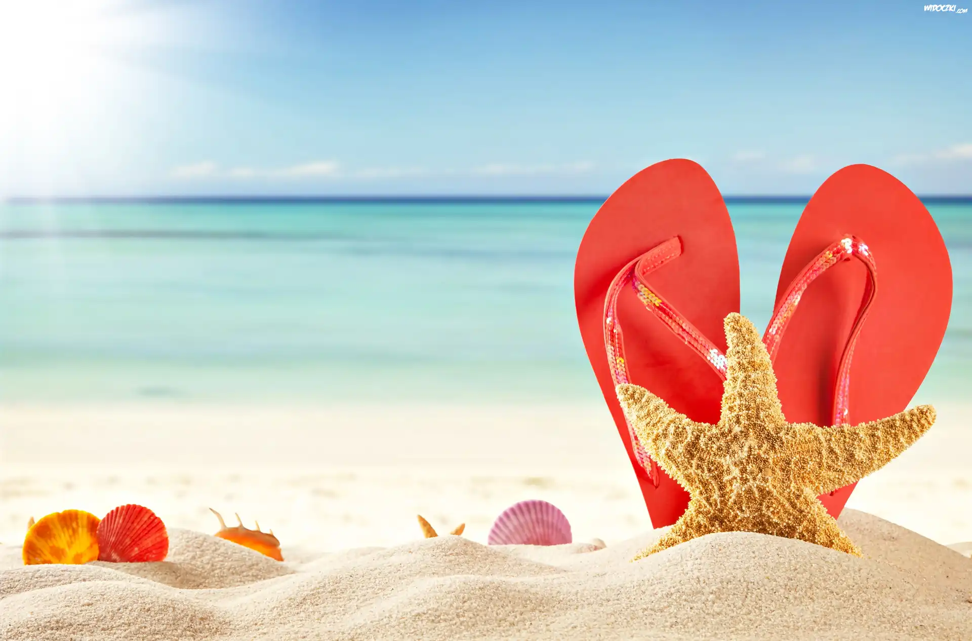 Lato, Morze, Plaża, Muszelki, Rozgwiazda, Klapki, Wakacje