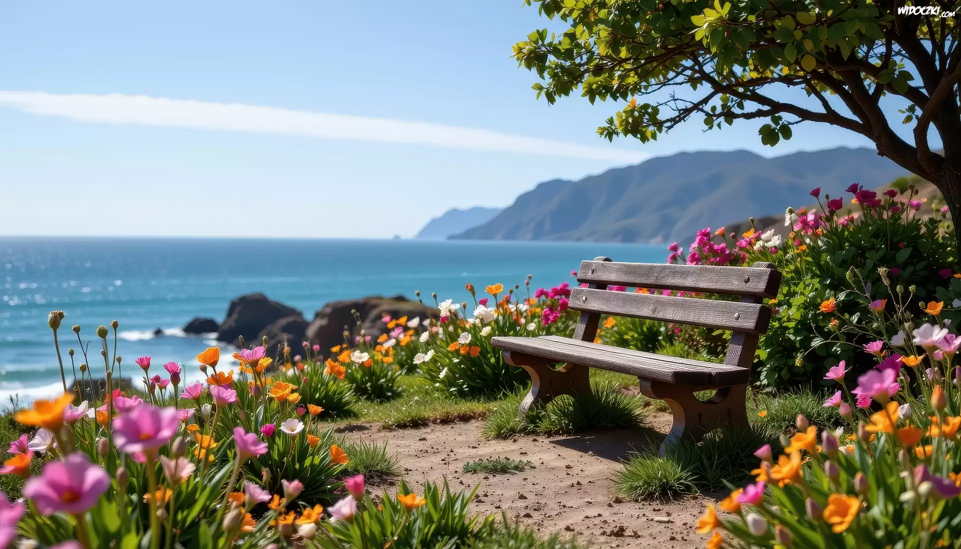 Zdjęcia, Ławka, Kwiaty, Drzewo, Morze