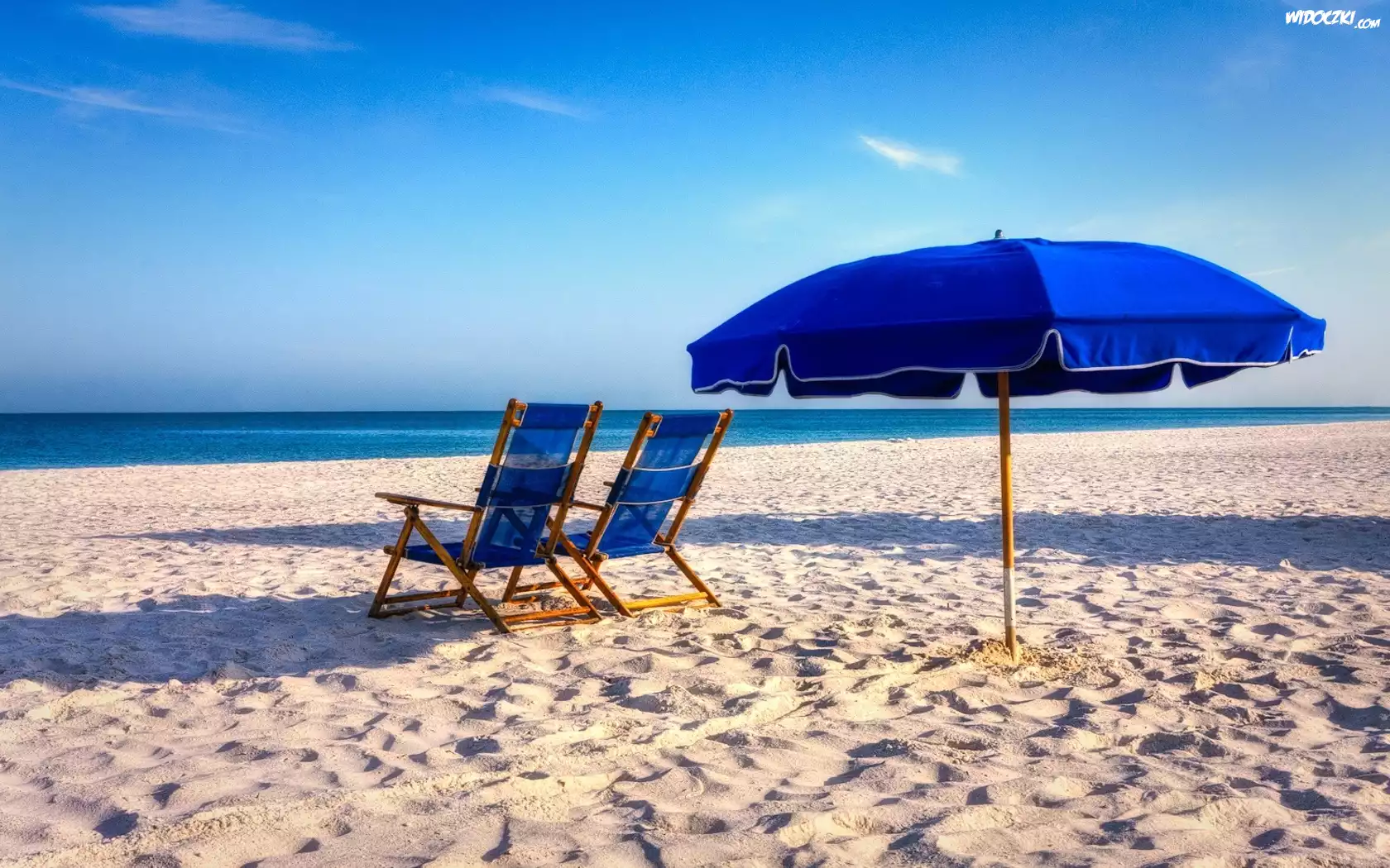 Zdjęcia, Morze, Plaża, Granatowe, Leżaki, Parasol, Wakacje