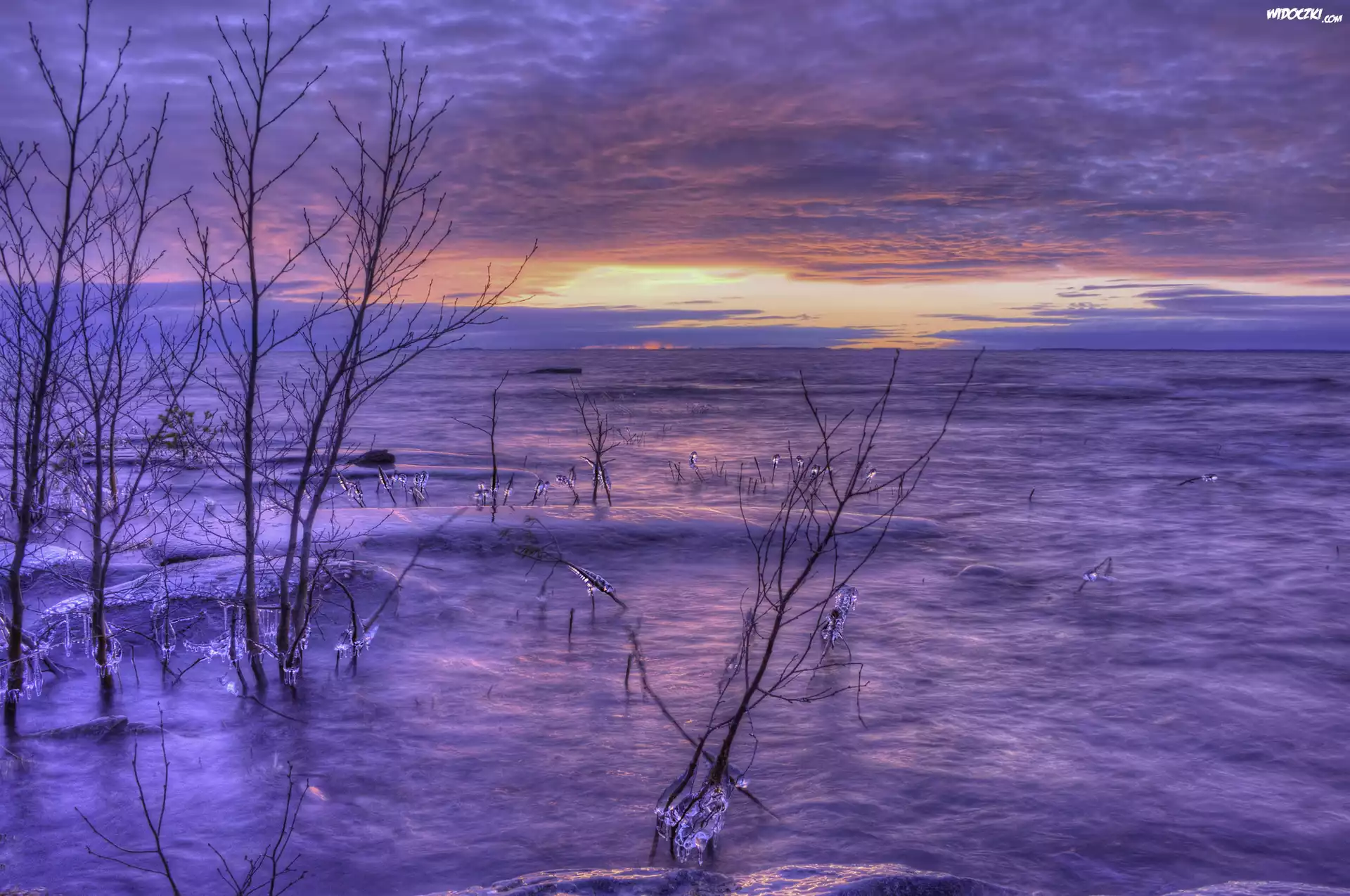Zdjęcia, Morze, Zachód, Słońca, Lód, Gałęzie