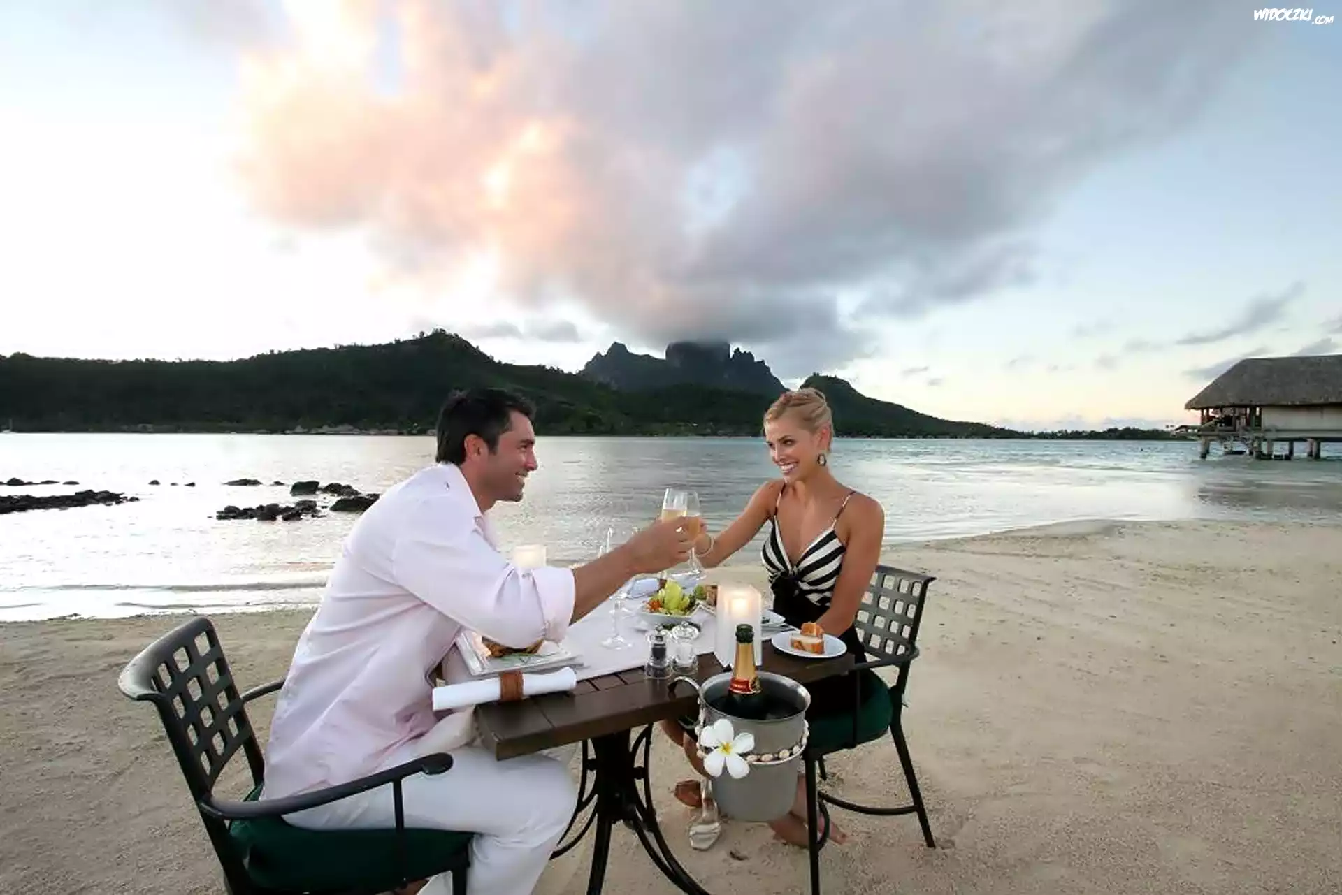 Zdjęcia, Morze, Plaża, Kobieta, Mężczyzna, Szampan