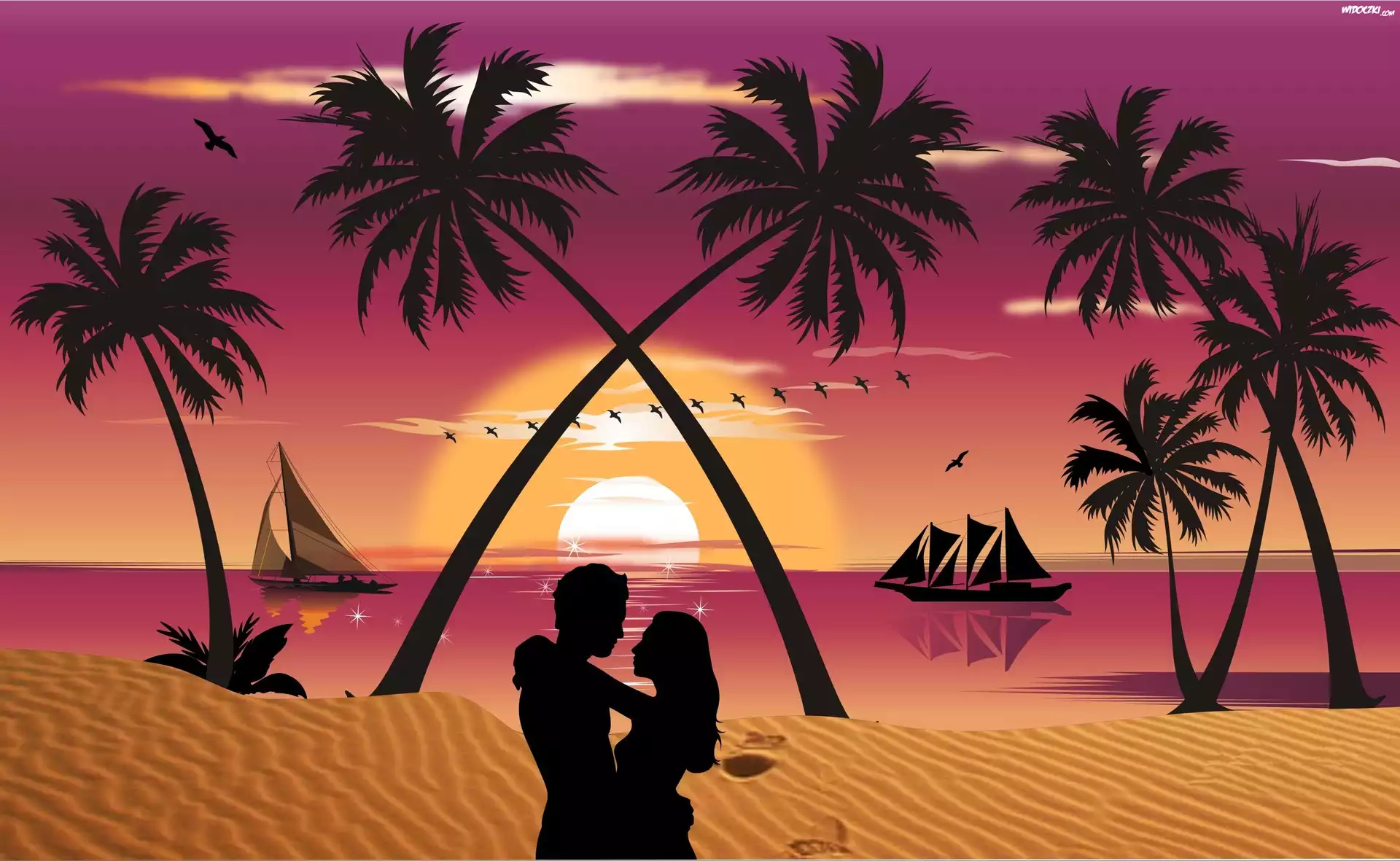 Zdjęcia, Morze, Plaża, Palmy, Mężczyzna, Kobieta