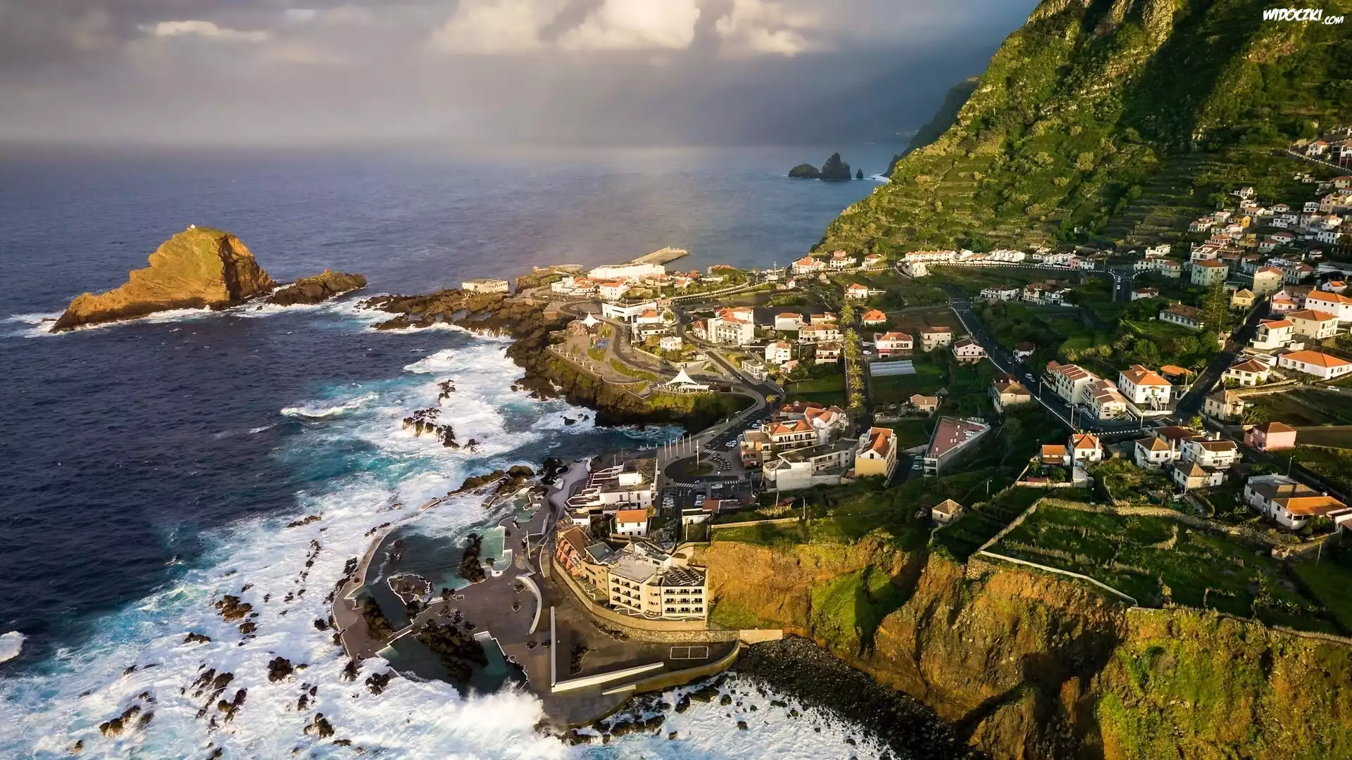 Morze, Opadająca, Mgła, Góra, Domy, Porto Moniz, Madera, Portugalia