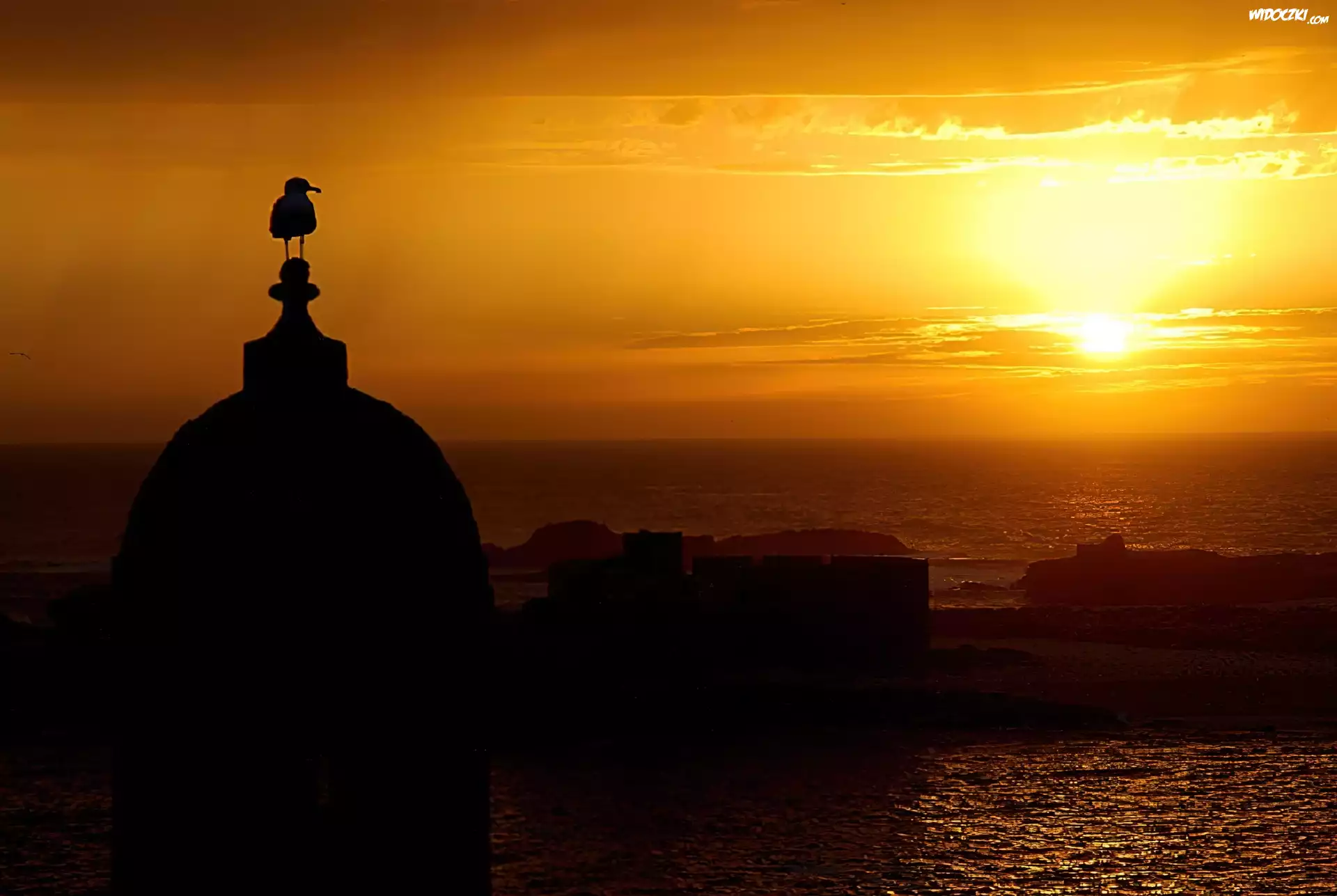 Zdjęcia, Morze, Zachód, Słońca, Ptak, Na, Dachu