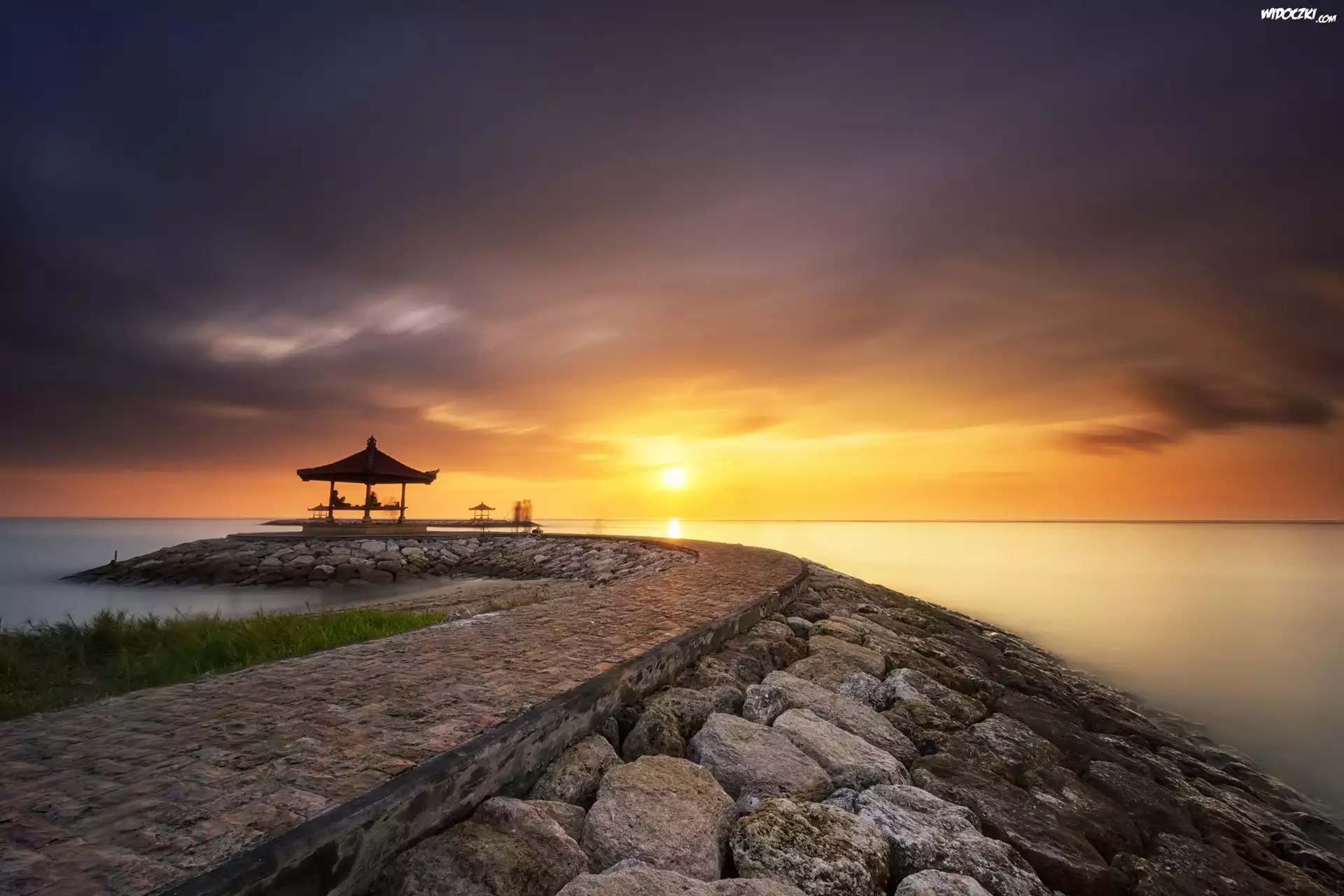 Morze, Zachod, Slonca, Molo, Niebo, Chmury