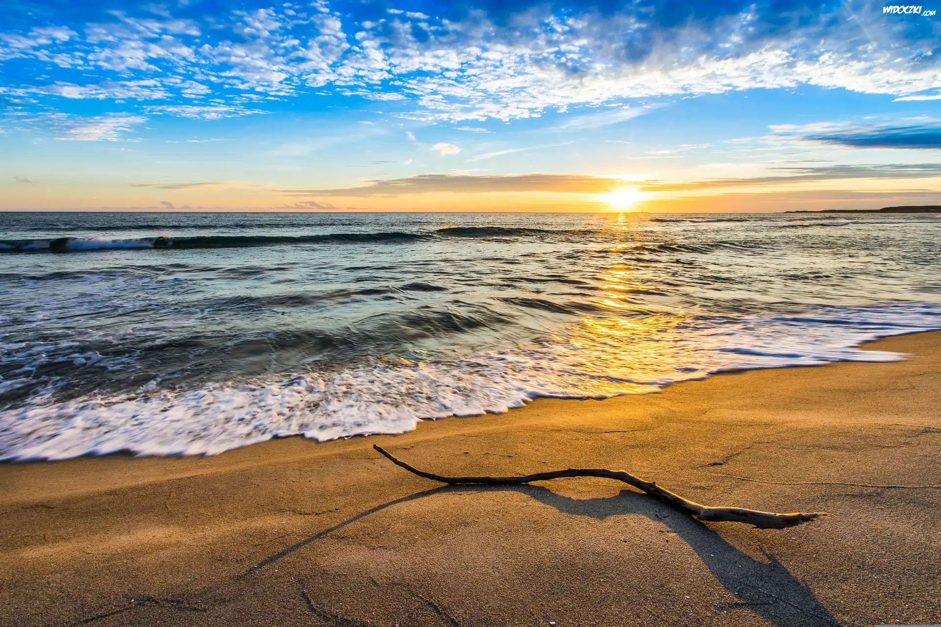 Zdjęcia, Morze, Wschód słońca, Niebo, Piasek