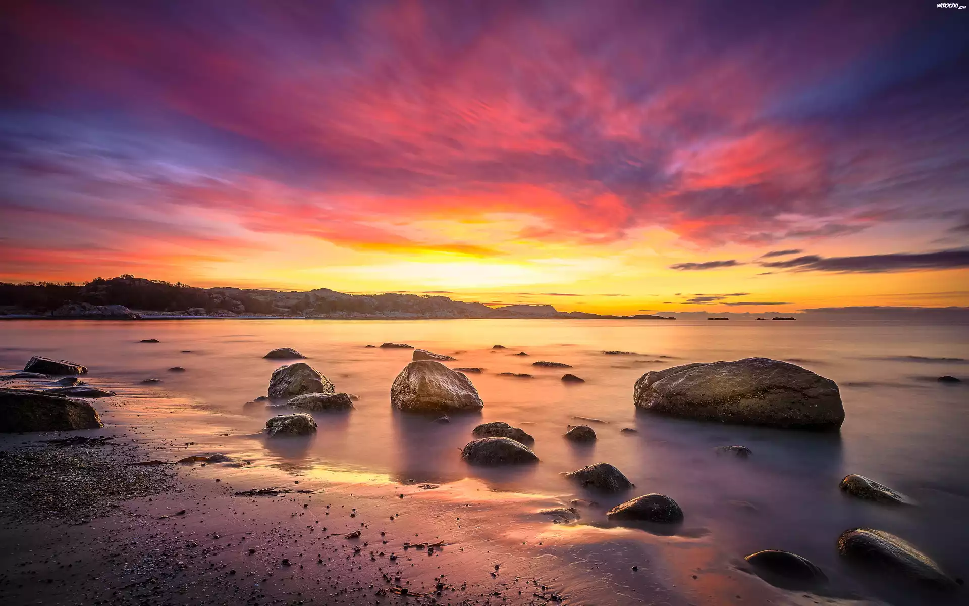 Zdjęcia, Morze, Zachód słońca, Niebo, Kamienie