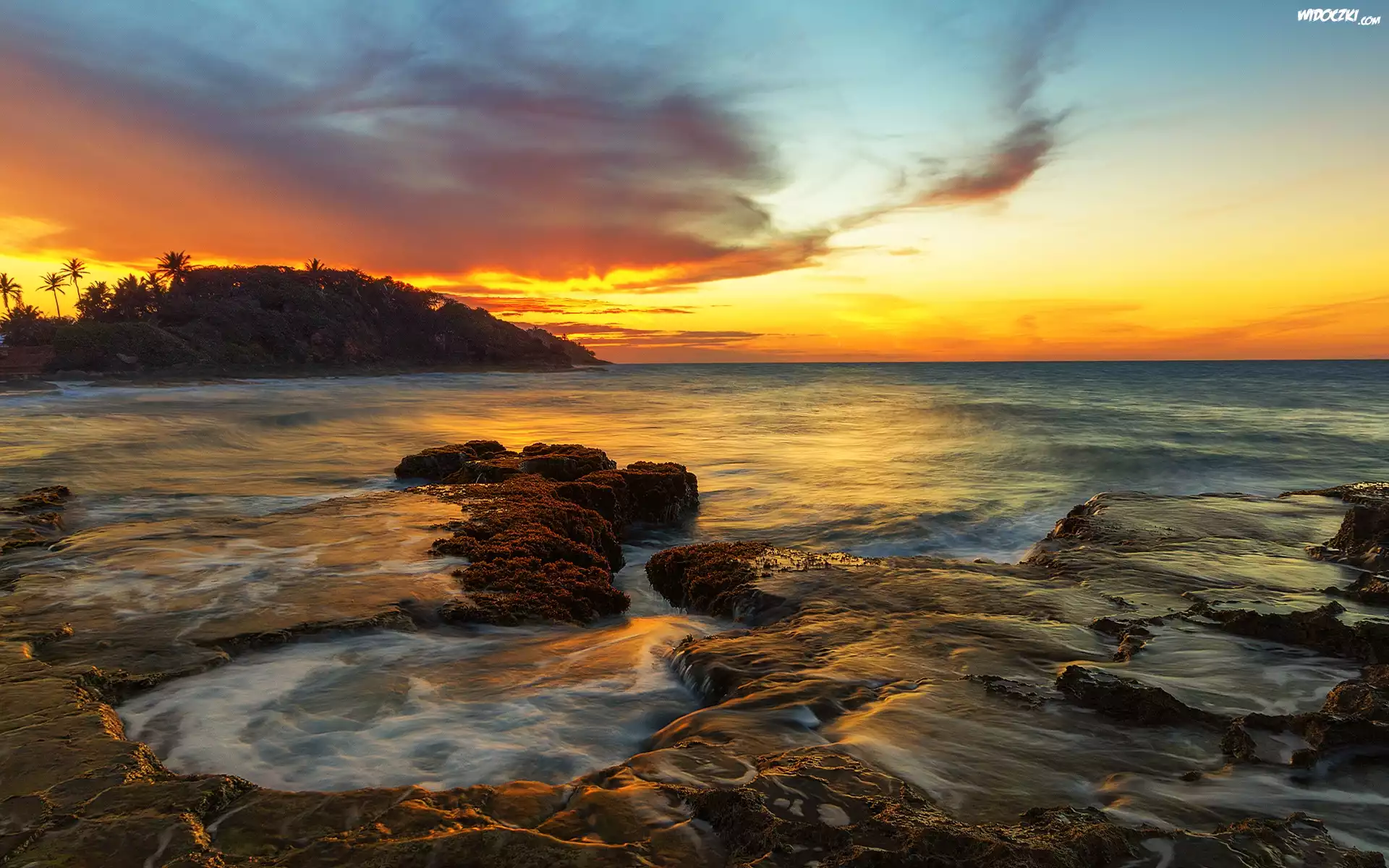 Morze, Zachód słońca, Niebo, Palmy