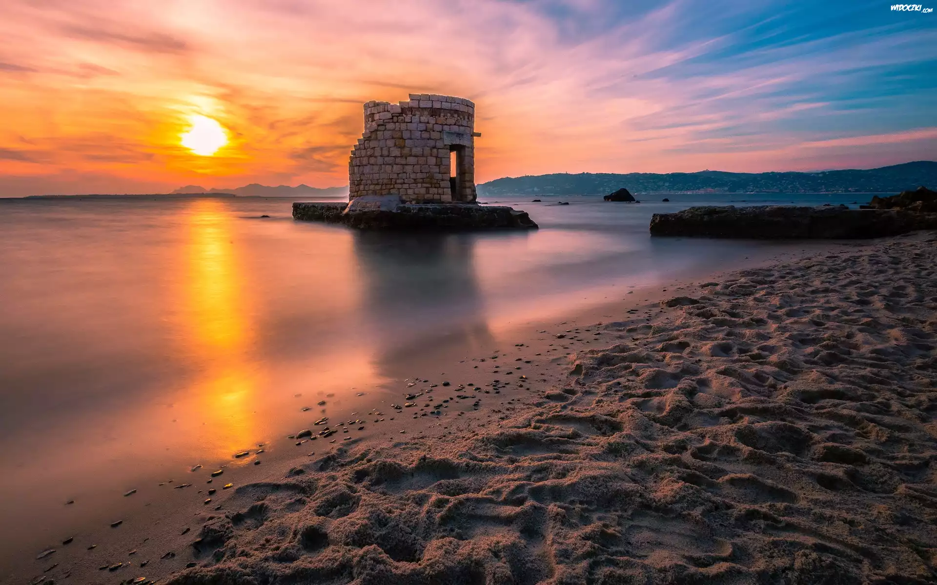 Morze, Zachód słońca, Niebo, Piasek