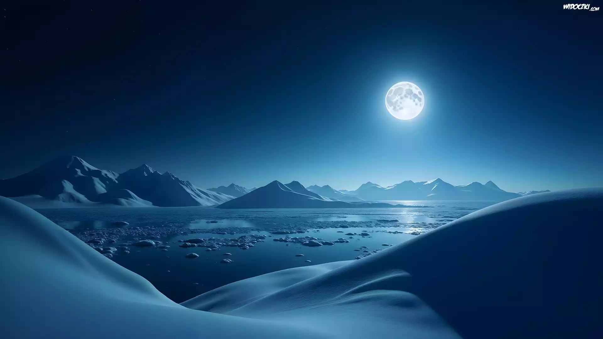Góry, Morze, Niebo, Księżyc, Zima
