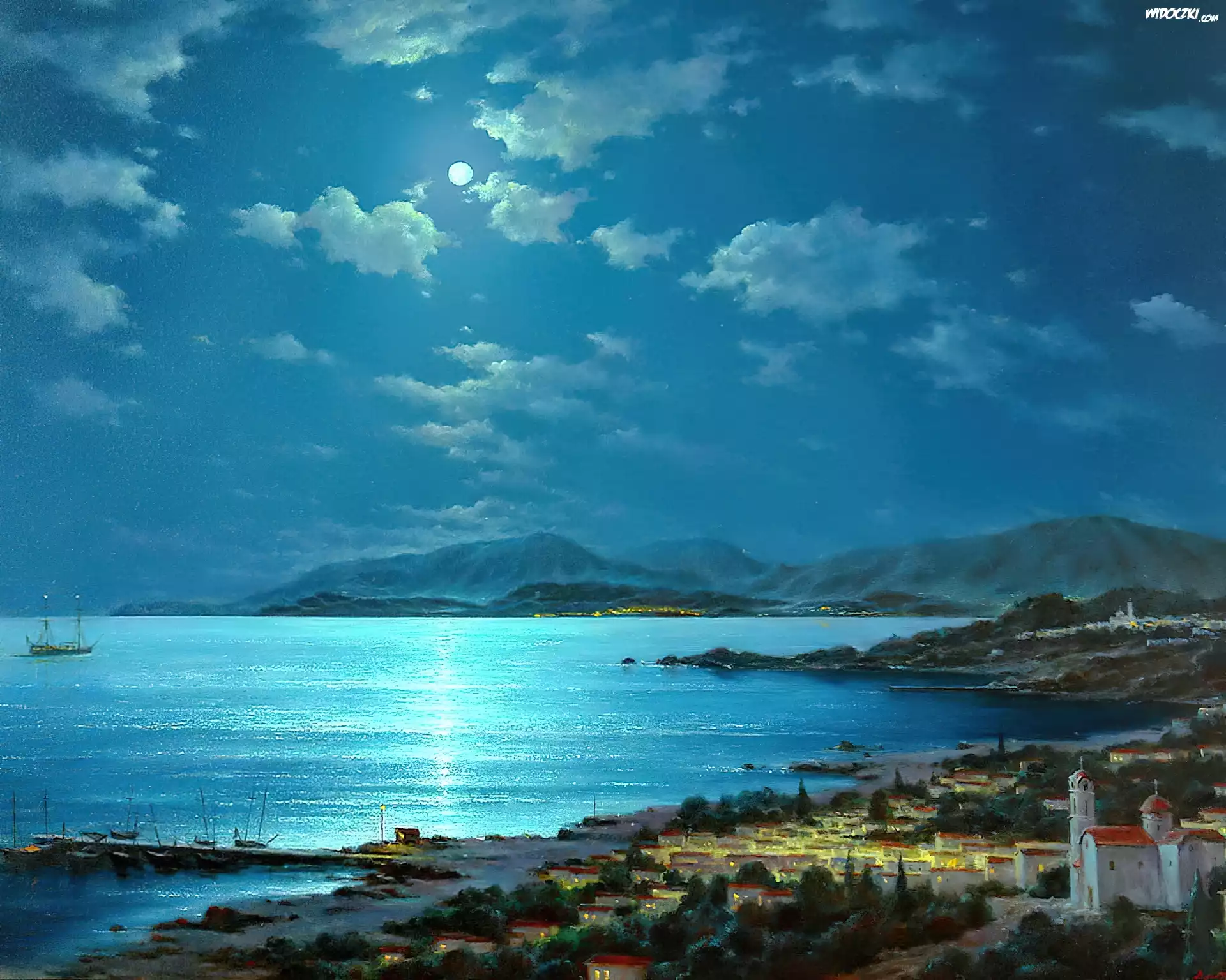 Zdjęcia, Morze, Góry, Noc, Miasteczko