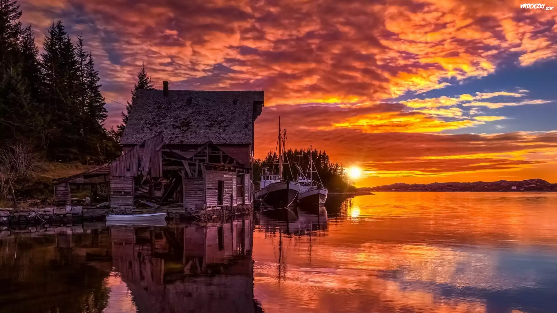 Zdjęcia, Norwegia, Wyspa Toftøya, Morze Północne, Kutry, Łodzie, Zachód słońca, Dom