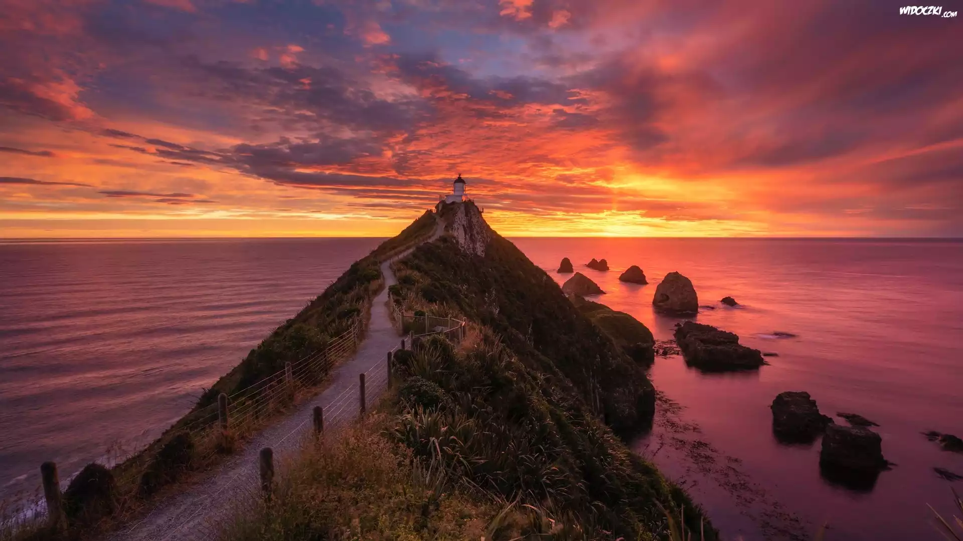 Morze, Latarnia morska, Nugget Point Lighthouse, Ścieżka, Skały, Zachód słońca, Otago, Nowa Zelandia |
