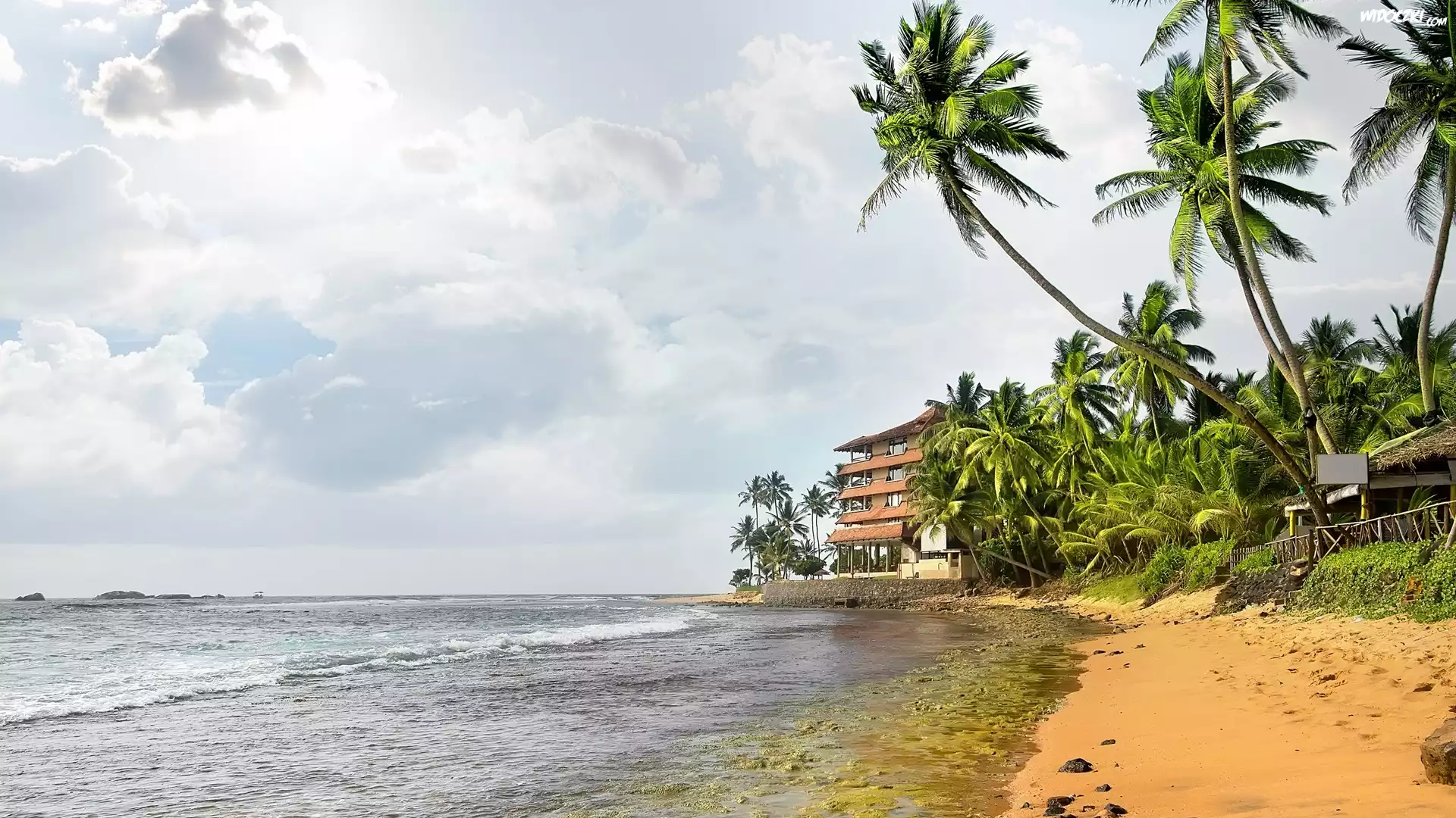 Zdjęcia, Morze, Plaża, Dom, Palmy, Chmury