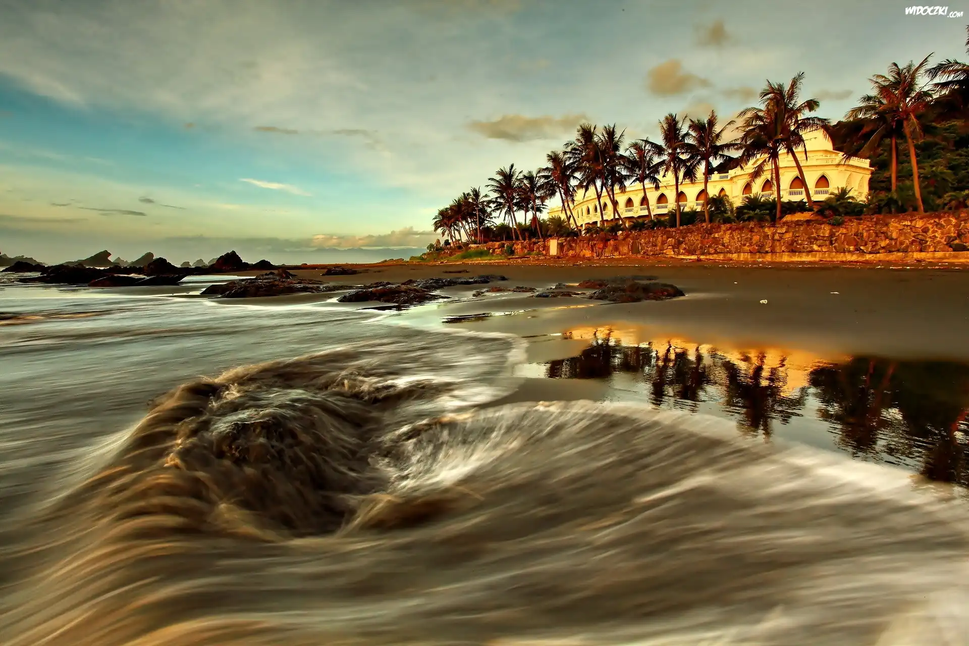 Zdj臋cia, Morze, Fale, Palmy, Brzeg