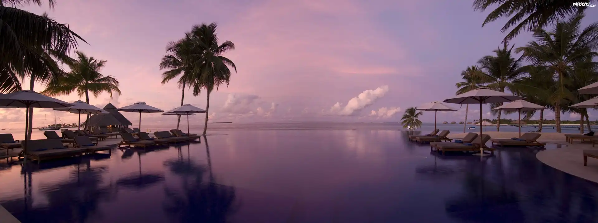 Zdjęcia, Morze, Parasole, Leżaki, Palmy, Malediwy, Wakacje