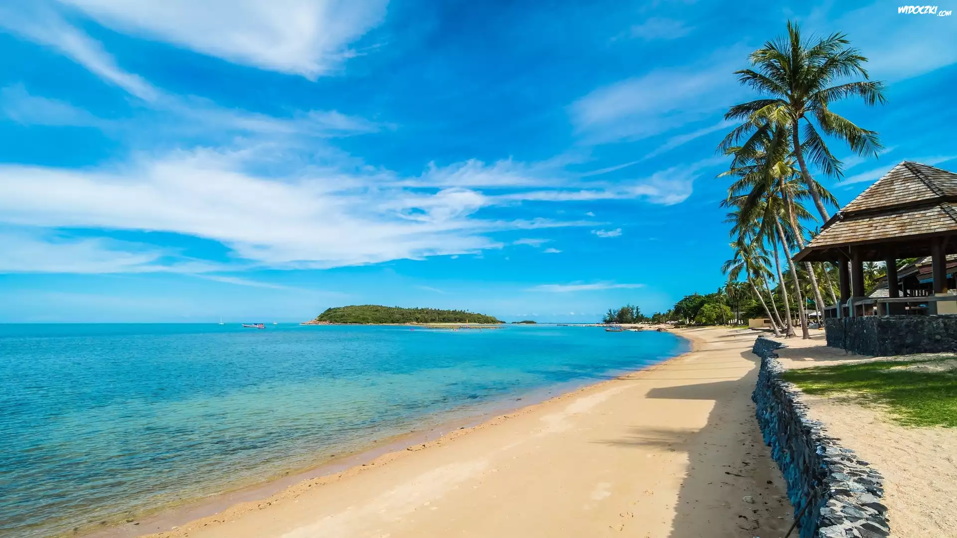 Morze, Brzeg, Plaża, Domki, Palmy, Chmury