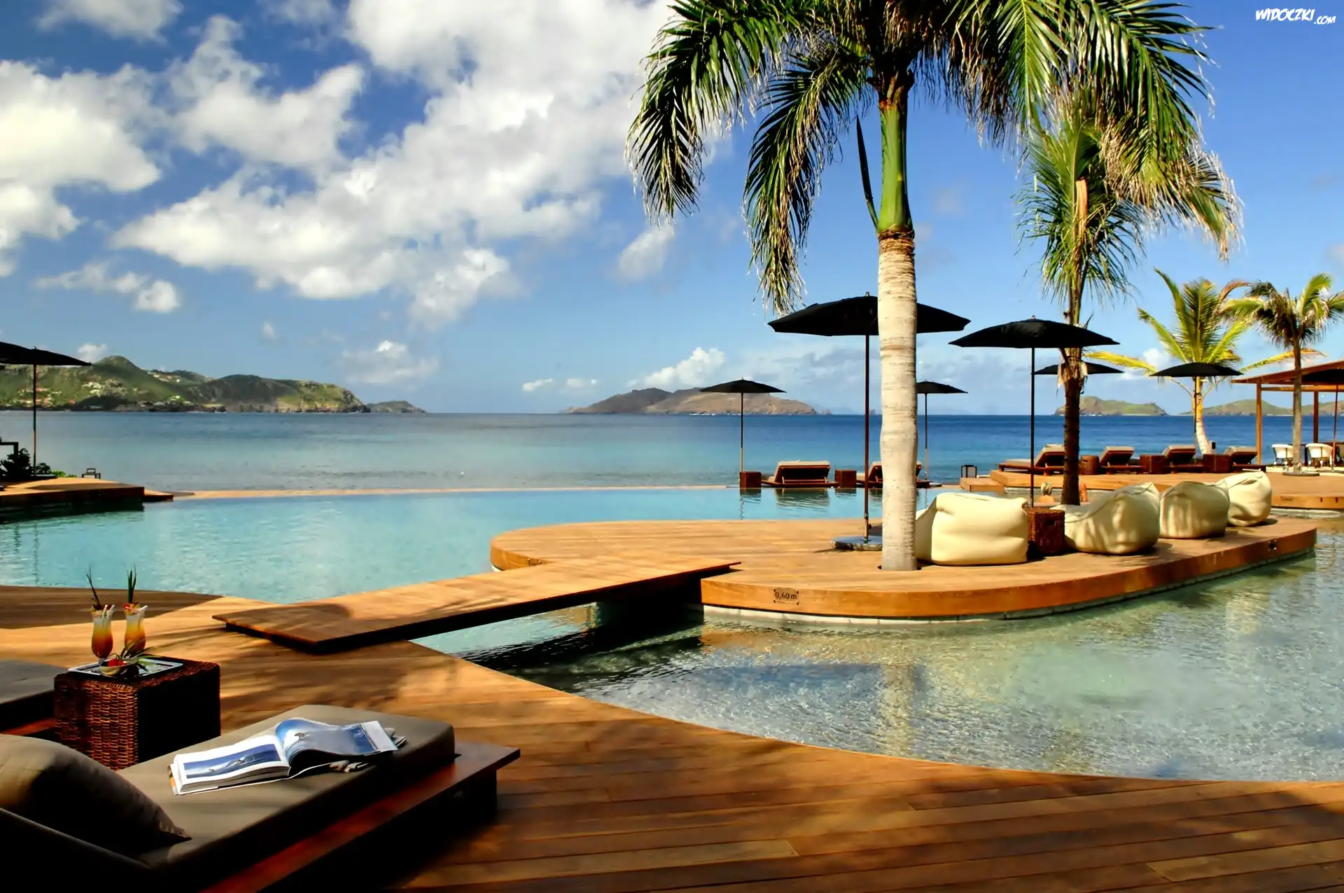 Zdjęcia, Morze, Plaża, Palmy, Parasole