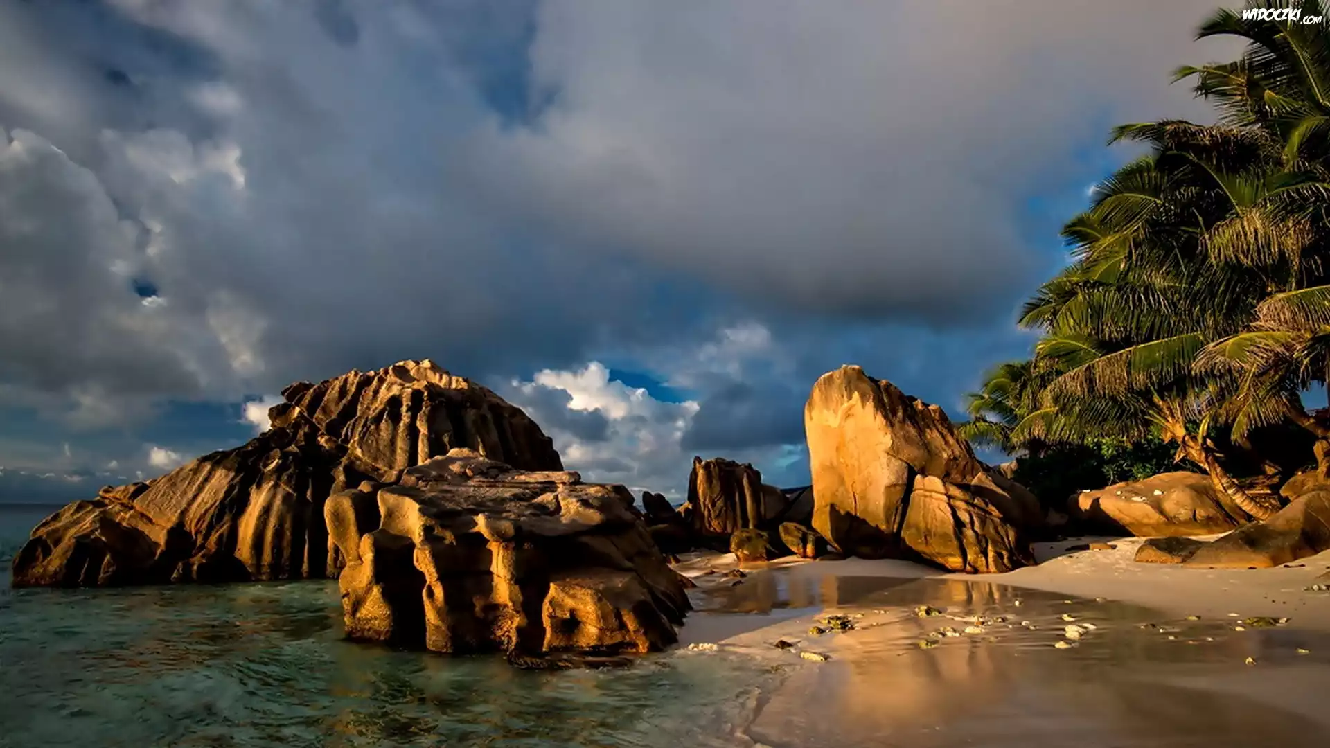 Zdjęcia, Morze, Skały, Palmy, Chmury