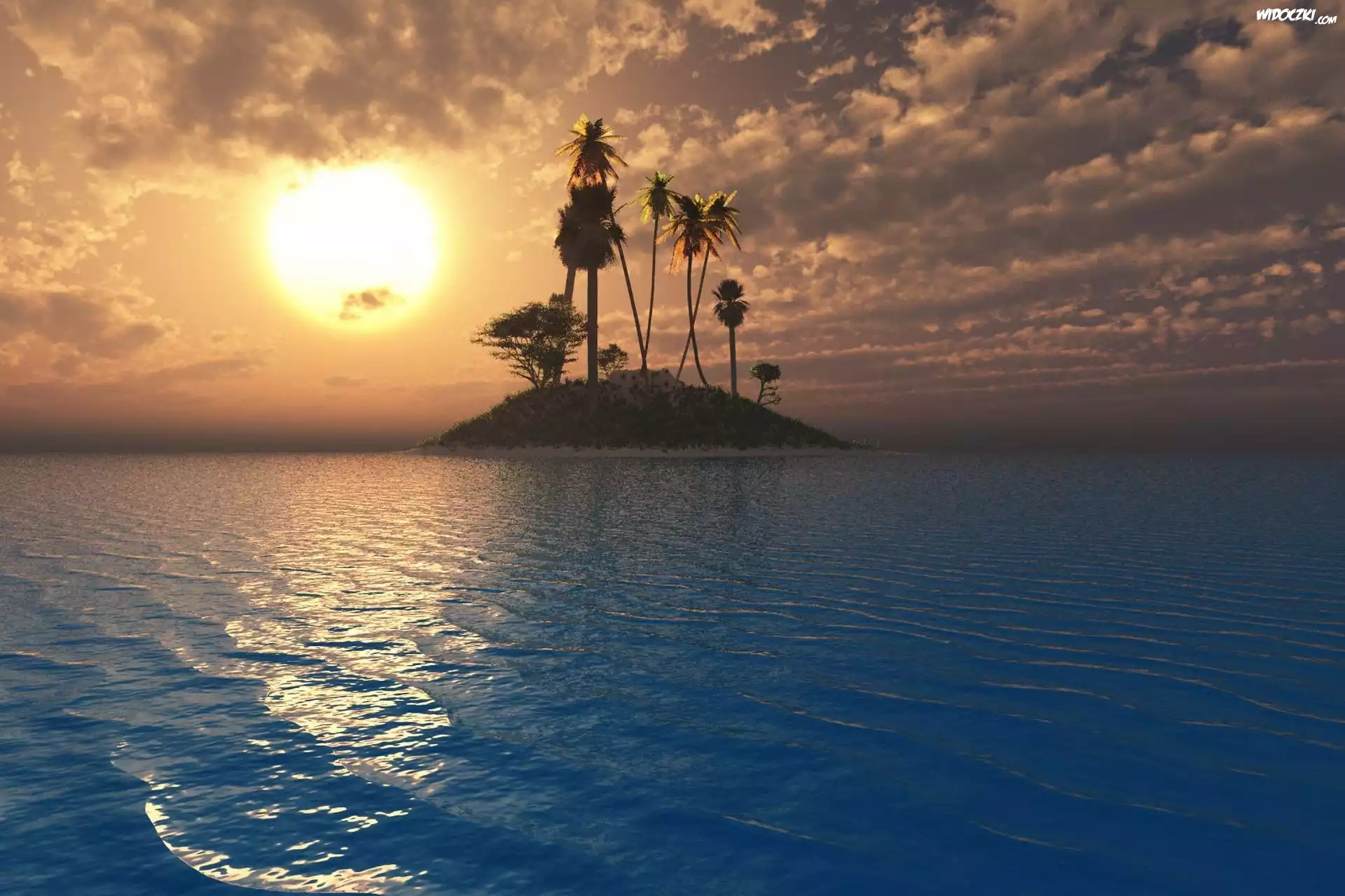 Morze, Zachód Słońca, Wyspa, Palmy, Chmury