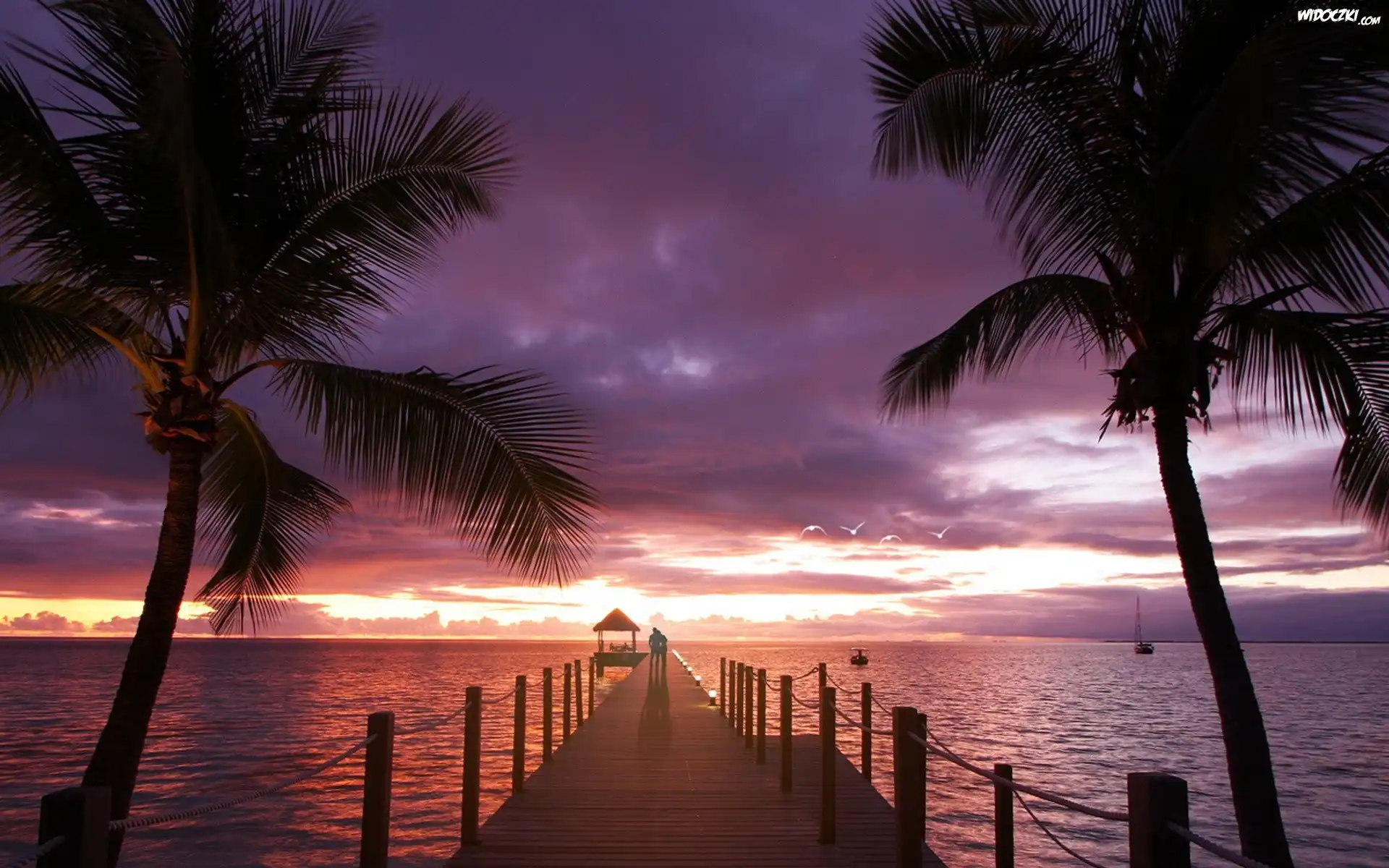 Zdjęcia, Morze, Zachód, Słońca, Palmy, Molo