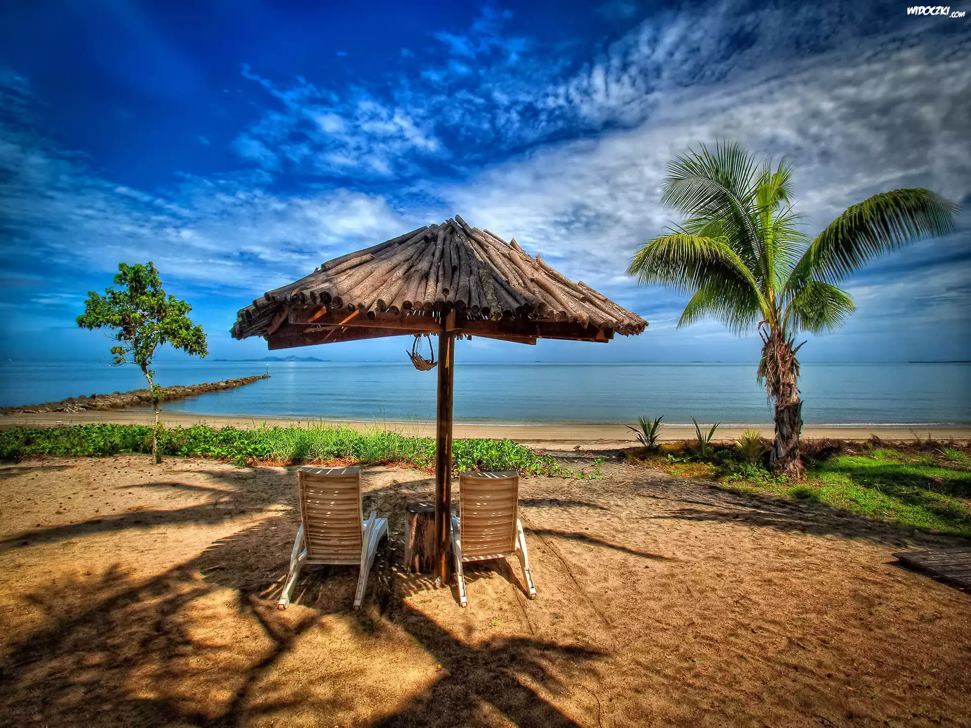 Zdjęcia, Morze, Palmy, Parasol, Leżaki