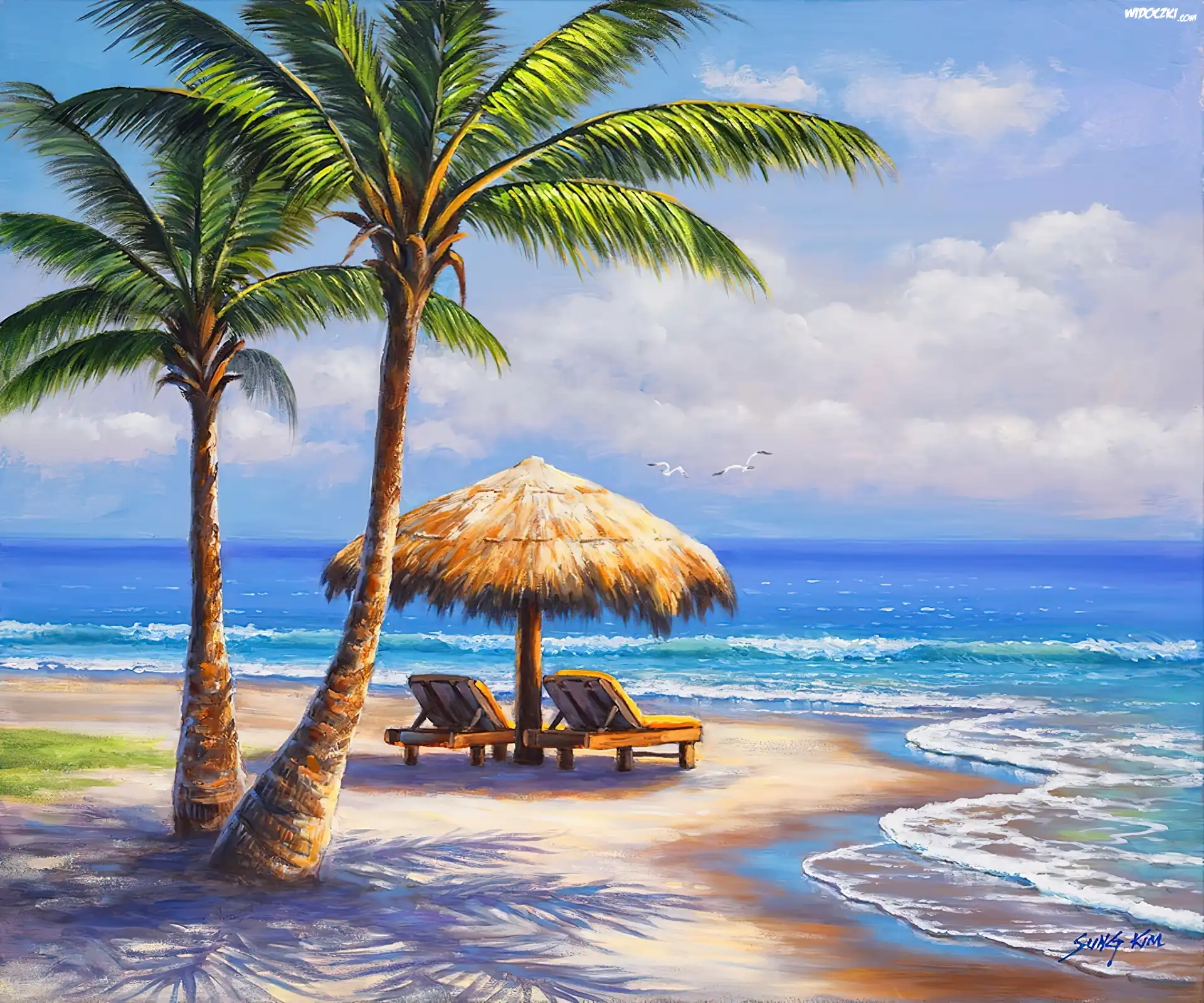 Morze, Plaża, Palmy, Parasol, Leżaki