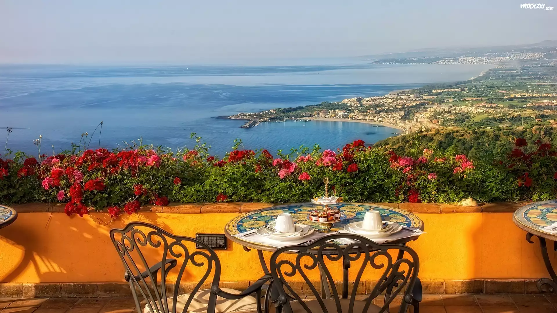 Zdjęcia, Morze, Zatoka, Pelargonie, Taras