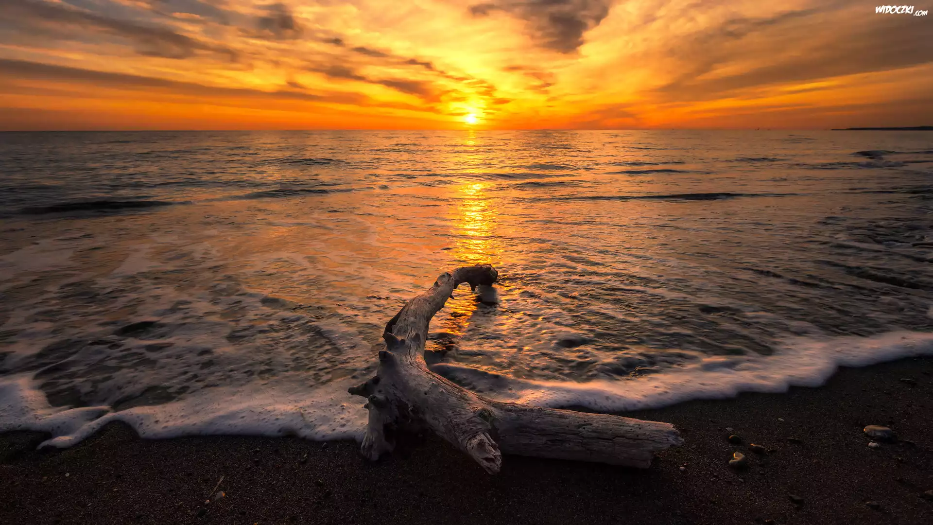 Uschnięty, Konar, Plaża, Morze, Fale, Zachód słońca