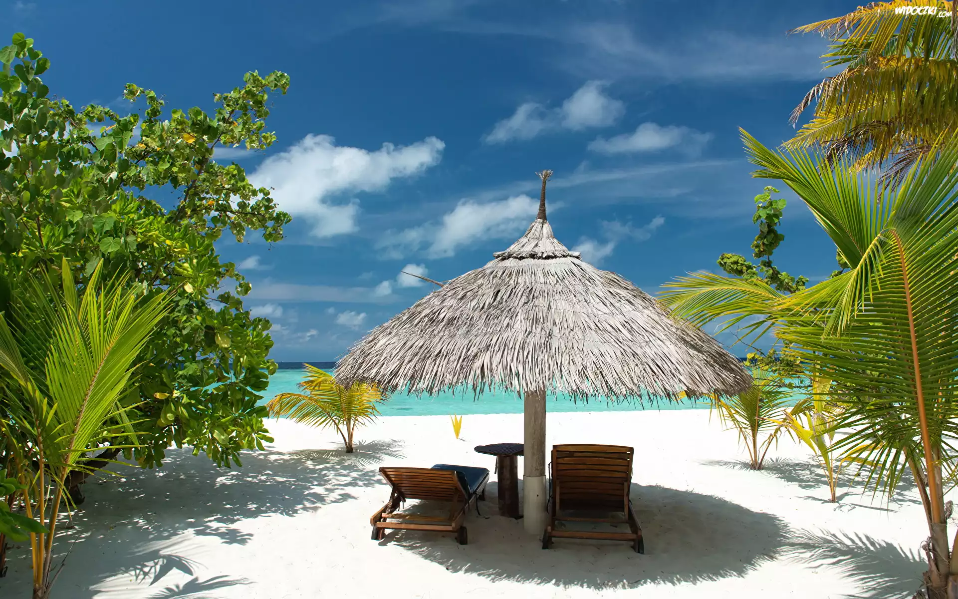 Zdjęcia, Plaża, Morze, Drzewa, Palmy, Leżaki, Parasol, Niebo