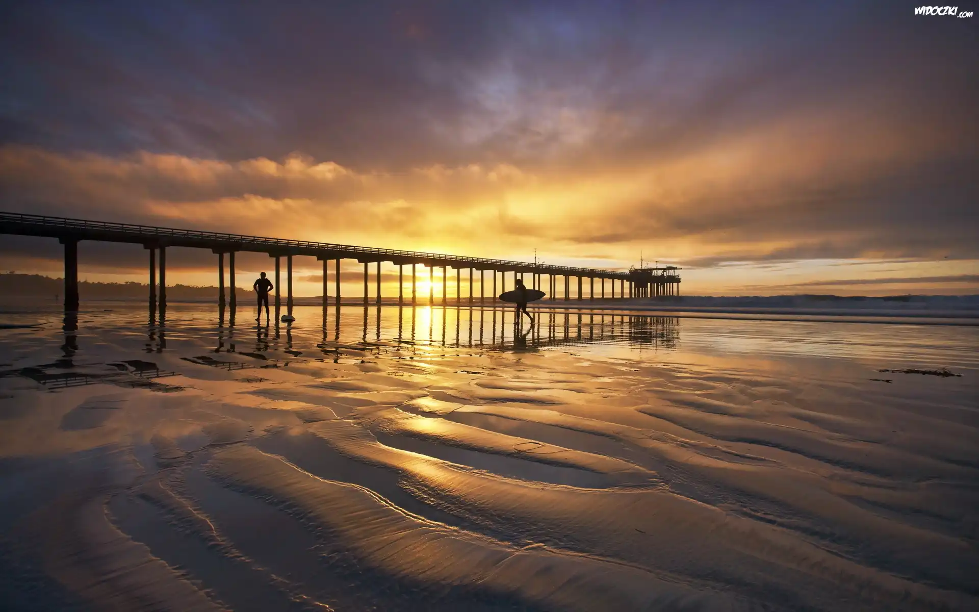 Morze, Zachód, Słońca, Molo, Plaża, Wczasowicze