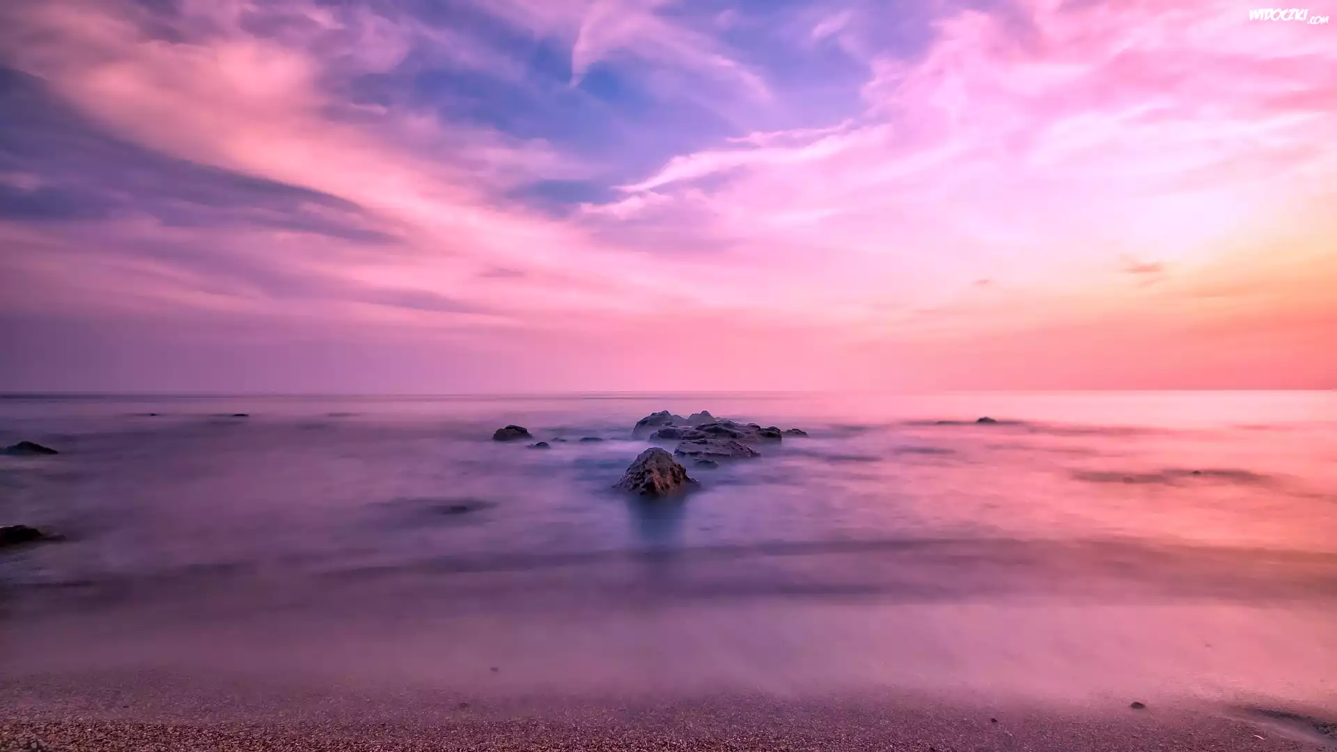 Zdjęcia, Plaża, Morze, Brzeg, Piasek, Skały, Wschód słońca