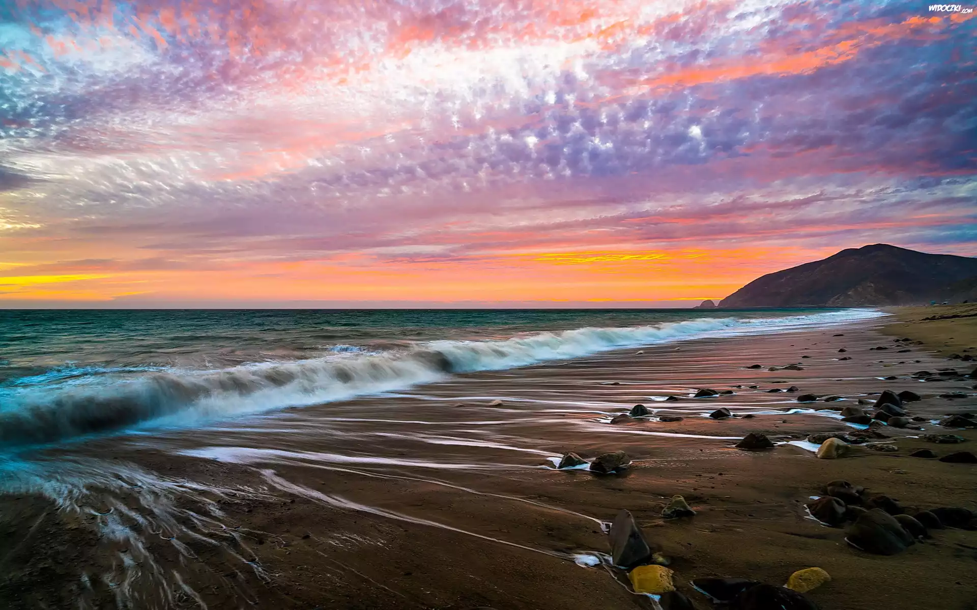 Zdjęcia, Morze, Zachód słońca, Plaża, Kamienie