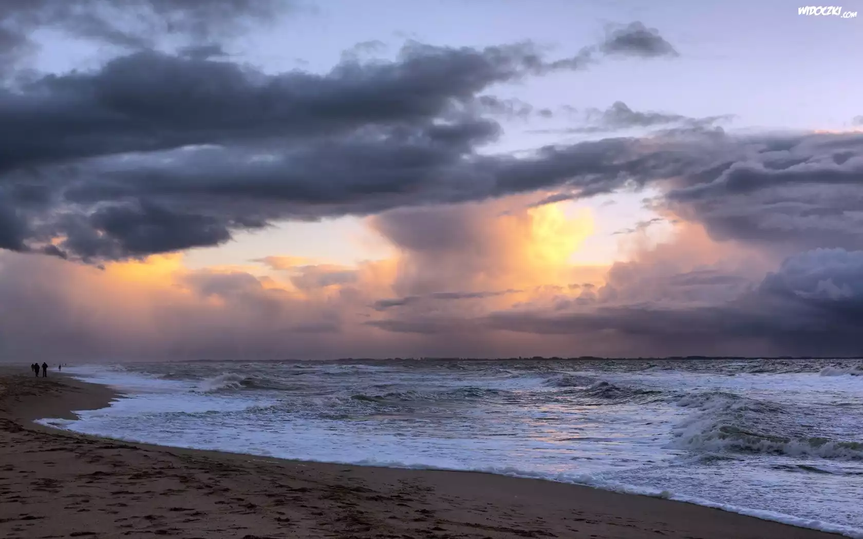 Plaża, Morze, Fale, Ludzie, Chmury, Przebijające, Światło
