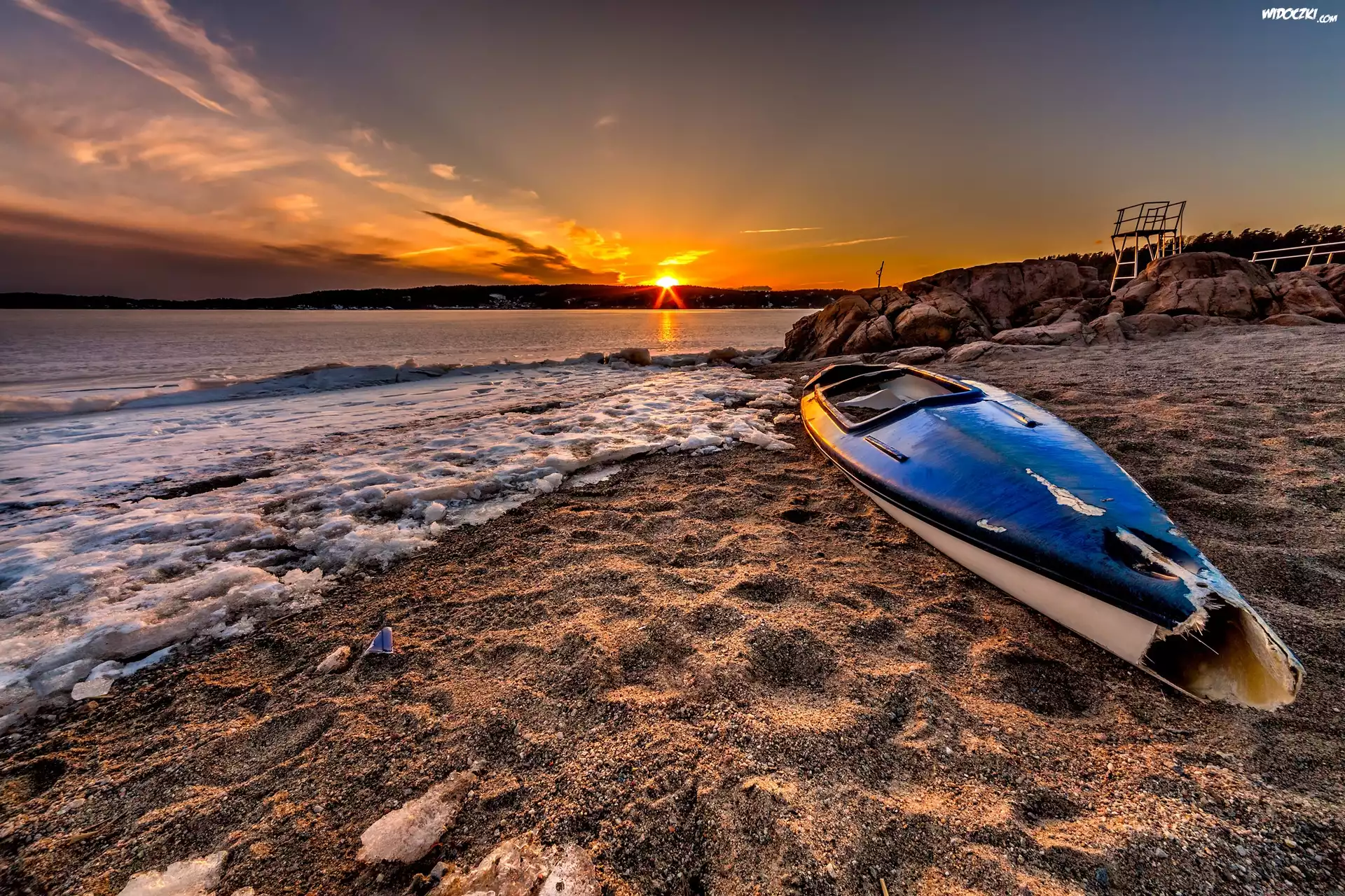 Zdjęcia, Morze, Plaża, Zachód, Słońca, Połamany, Kajak