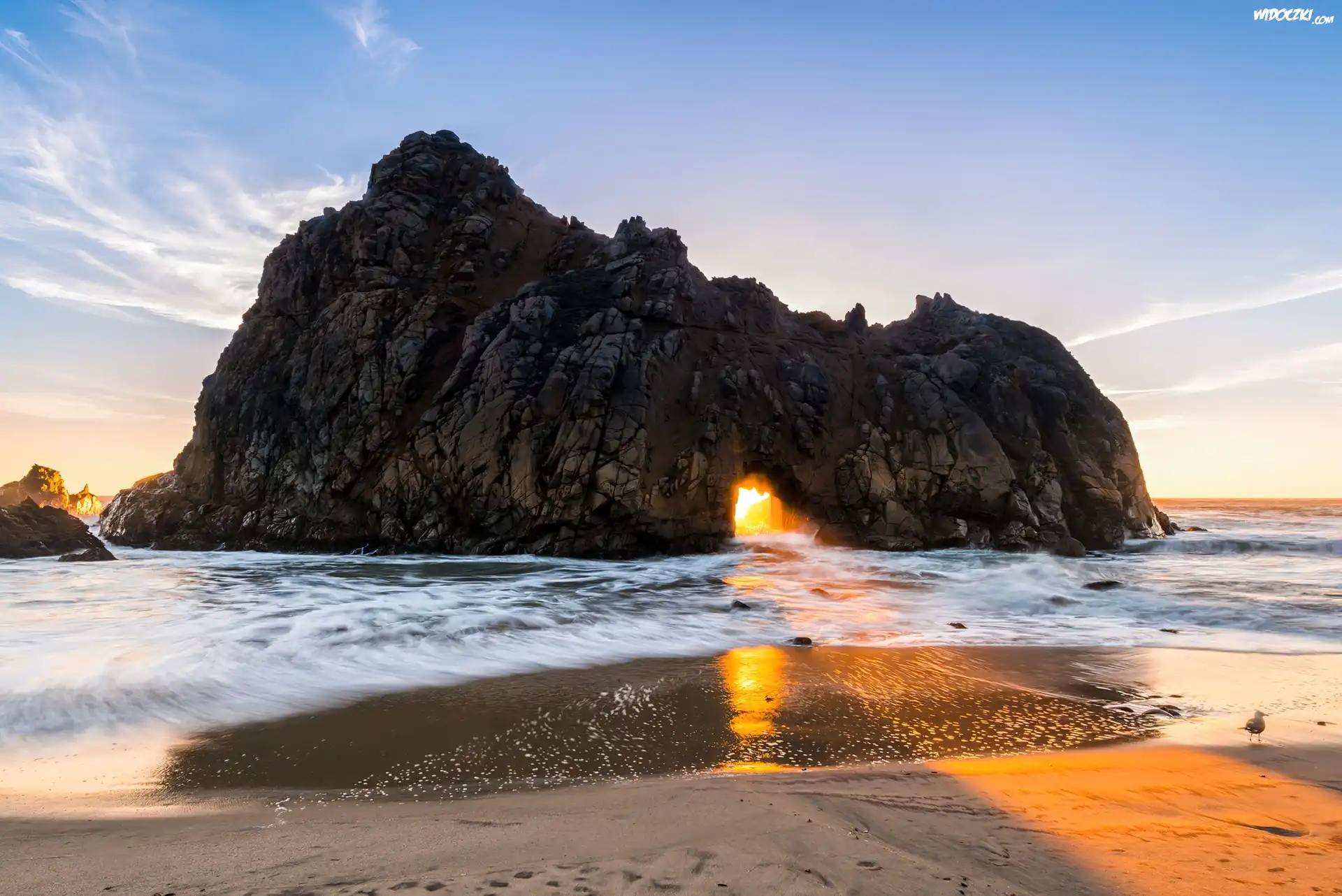 Zdjęcia, Morze, Plaża, Skała, Przebijające Światło