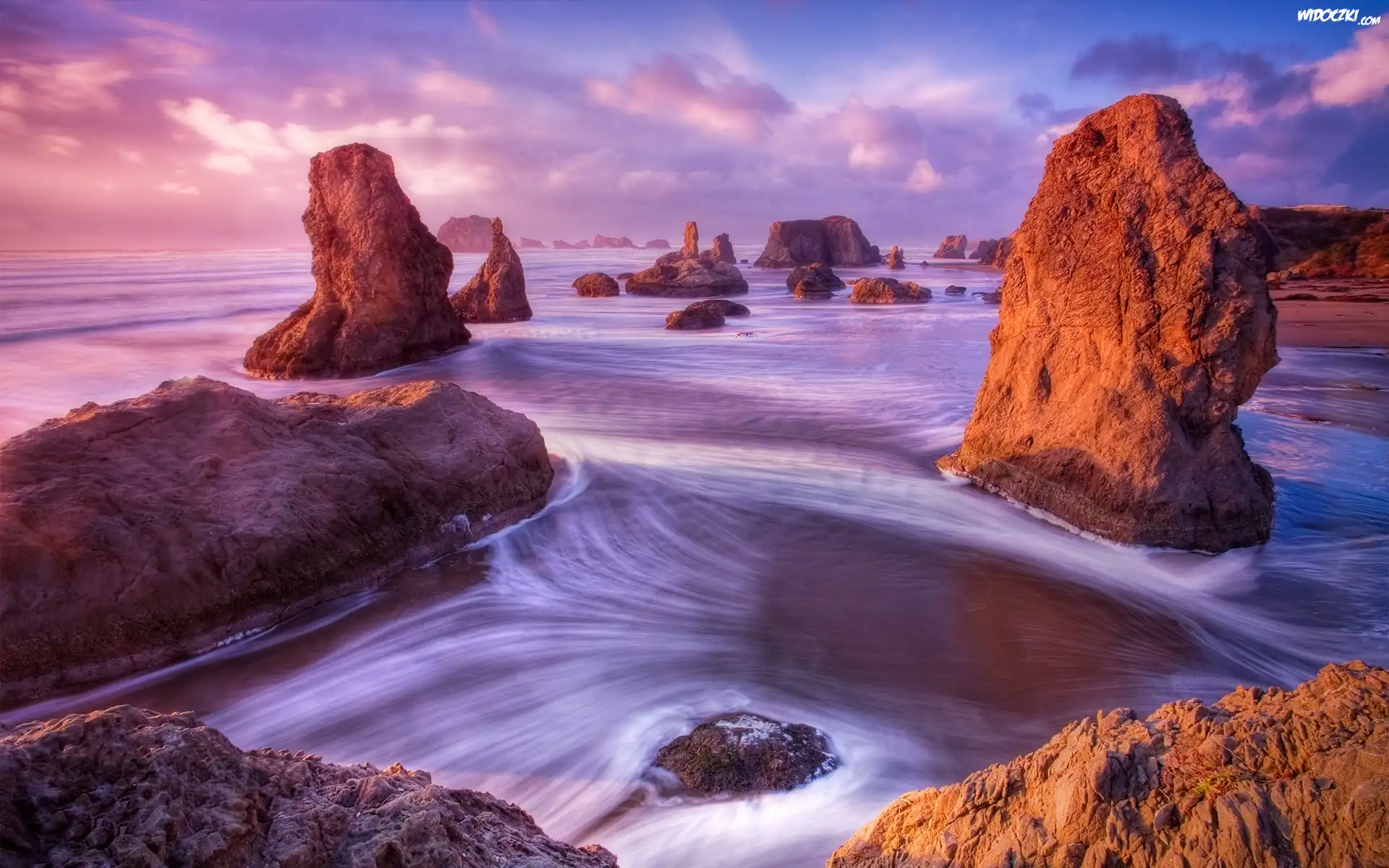 Zdjęcia, Morze, Skały, Purpurowe, Niebo