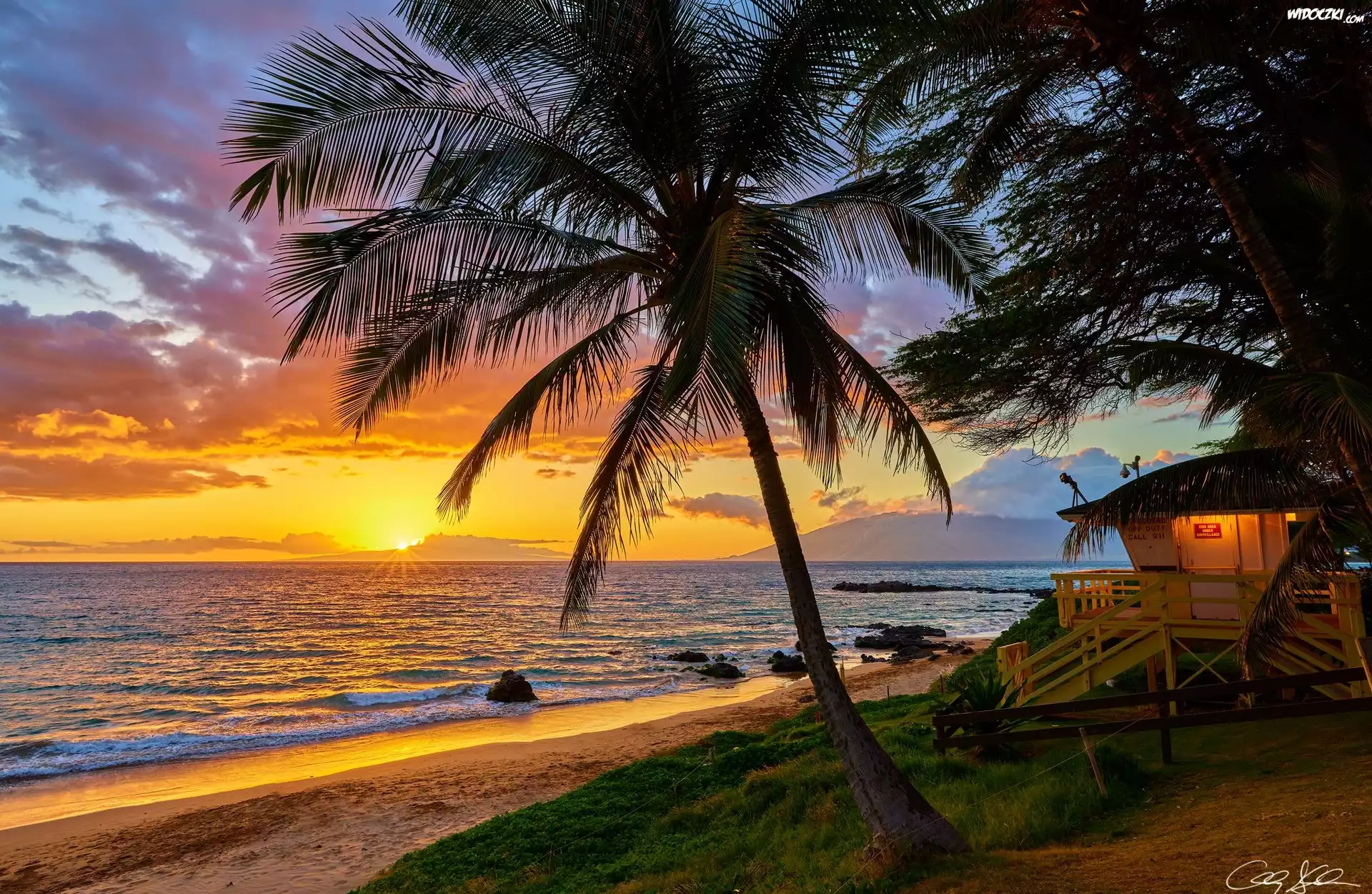 Zdjęcia, Hawaje, Morze, Palmy, Wschód słońca, Chmury, Wieża ratownicza