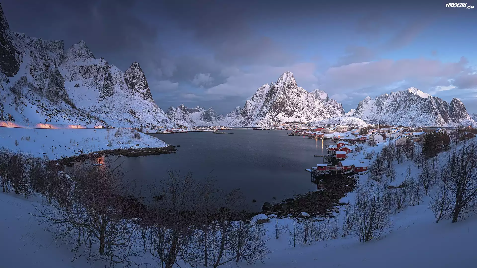 Zdjęcia, Zima, Śnieg, Morze Norweskie, Reine, Wyspa Moskenesoya, Góry, Domy, Lofoty, Norwegia
