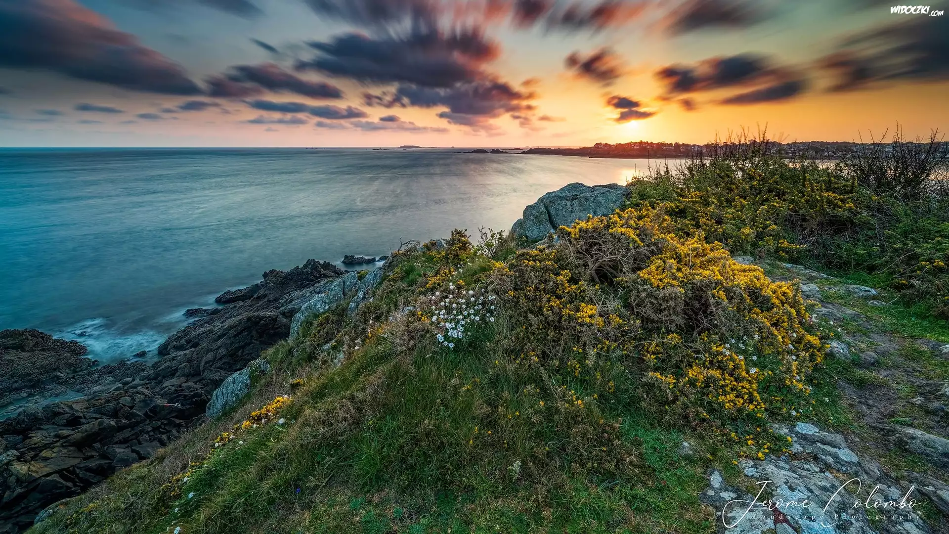 Morze, Wybrzeże, Skały, Roślinność, Bretania, Pointe de la Garde Guerin, Francja, Wschód słońca |