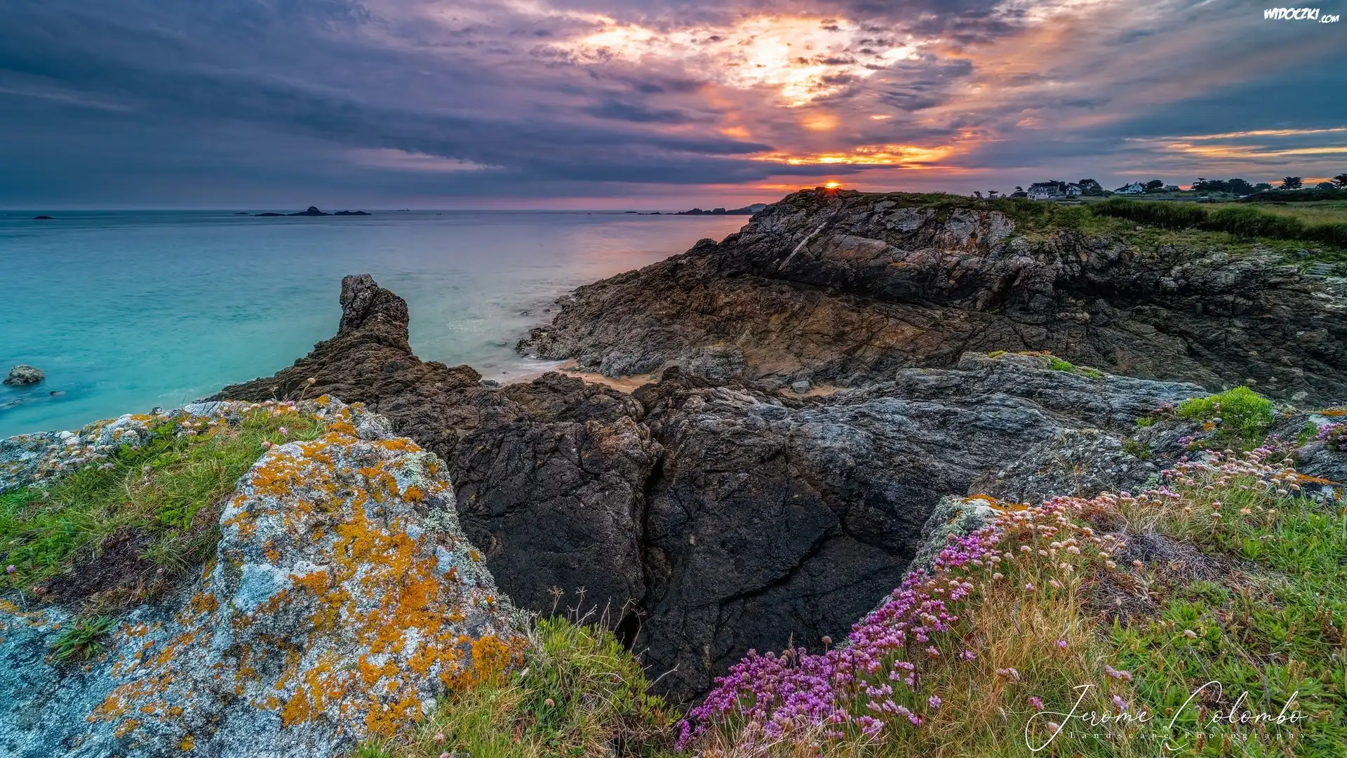 Morze, Wybrzeże, Skały, Roślinność, Zachód słońca, Przylądek, Pointe de la Varde, Bretania, Francja |