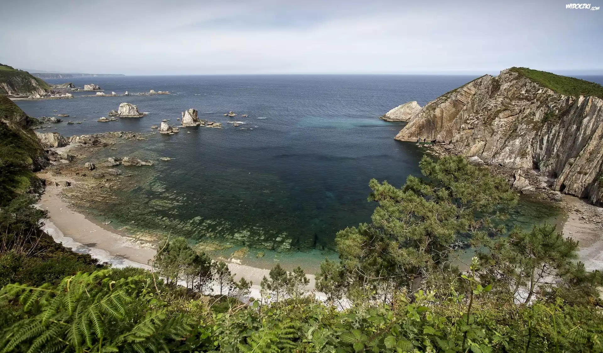 Zdjęcia, Morze, Wybrzeże, Skały, Rośliny, Drzewa
