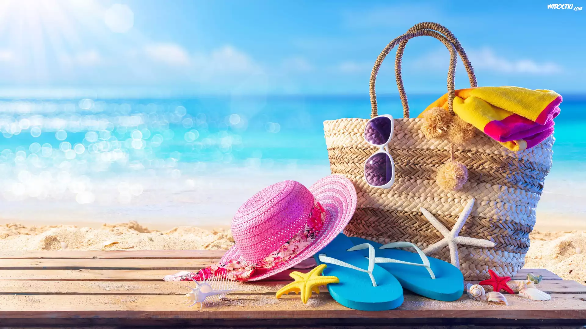 Zdjęcia, Morze, Plaża, Deski, Koszyk, Kapelusz, Japonki, Ręcznik, Okulary, Rozgwiazdy, Kompozycja