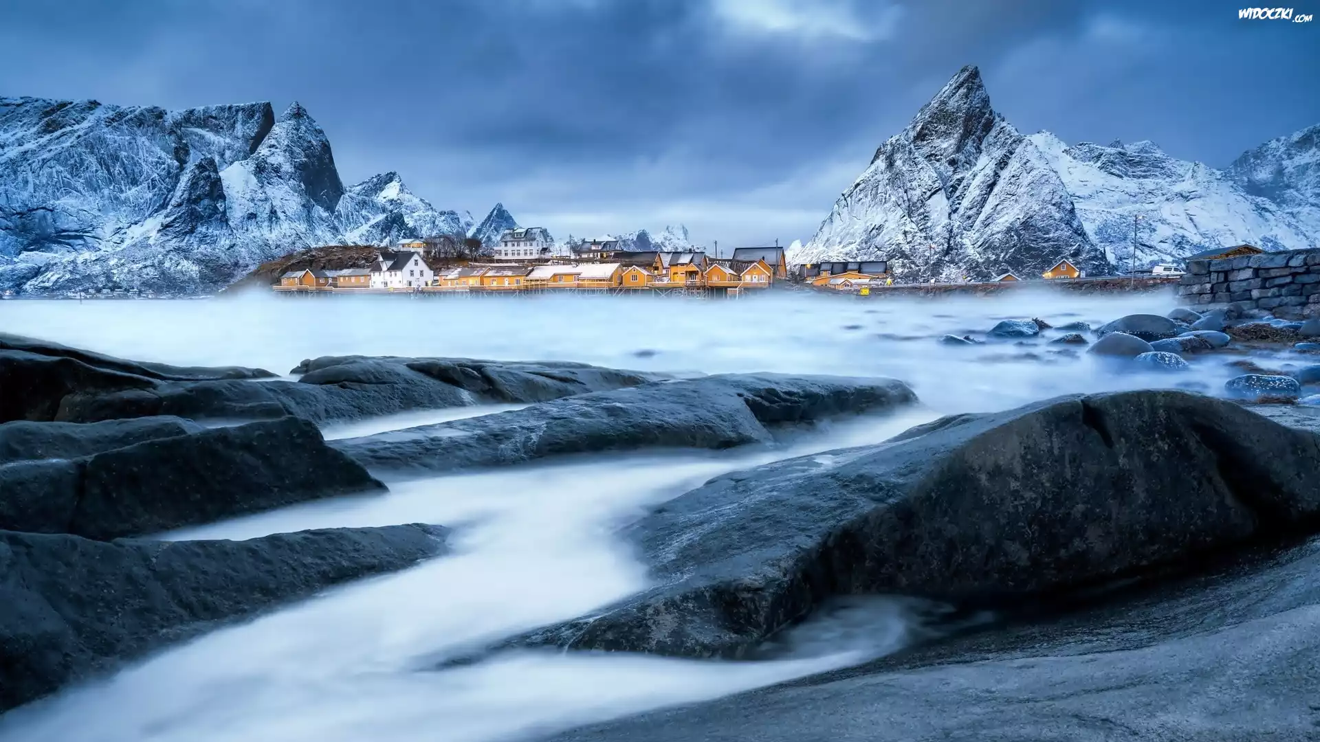 ZdjÄ™cia, Norwegia, Lofoty, Góry, Wioska Sakrisøy, Kamienie, Zima, Morze