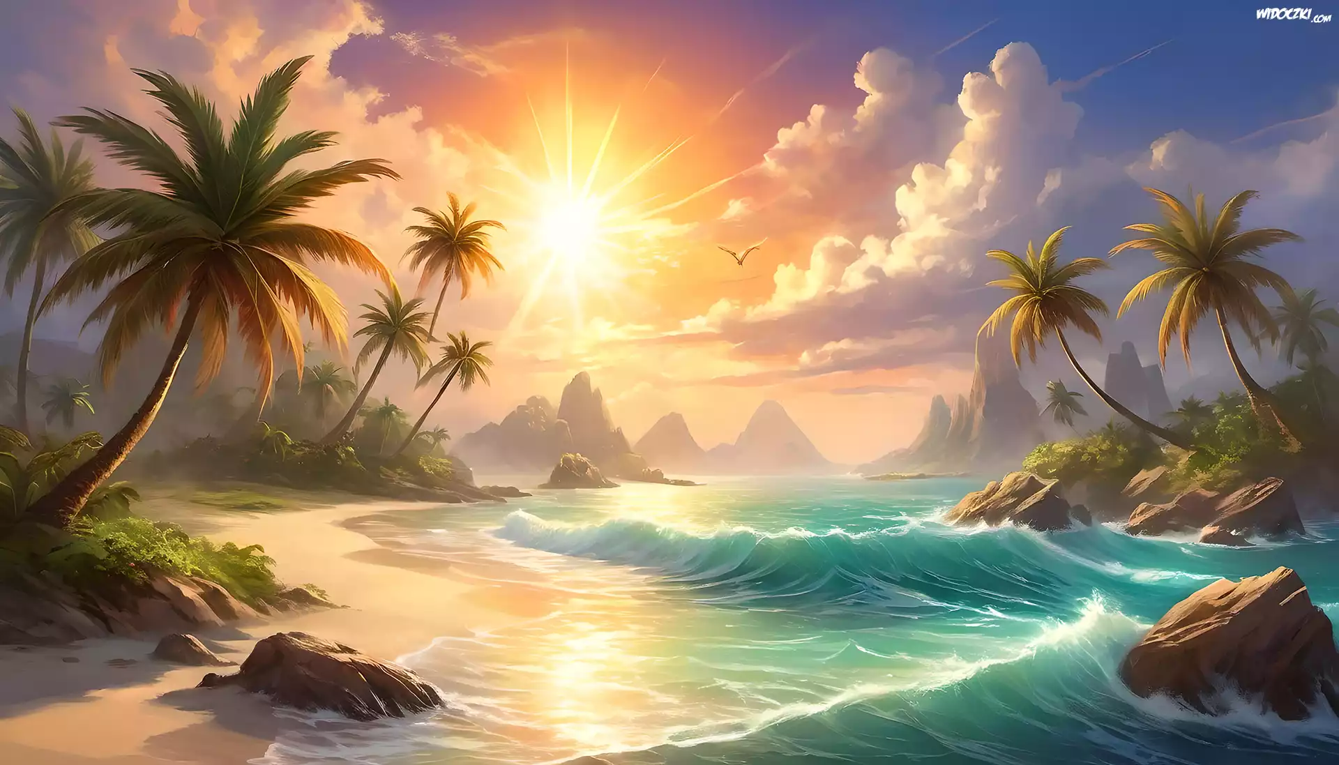 Palmy, Morze, Skały, Słońce, Grafika