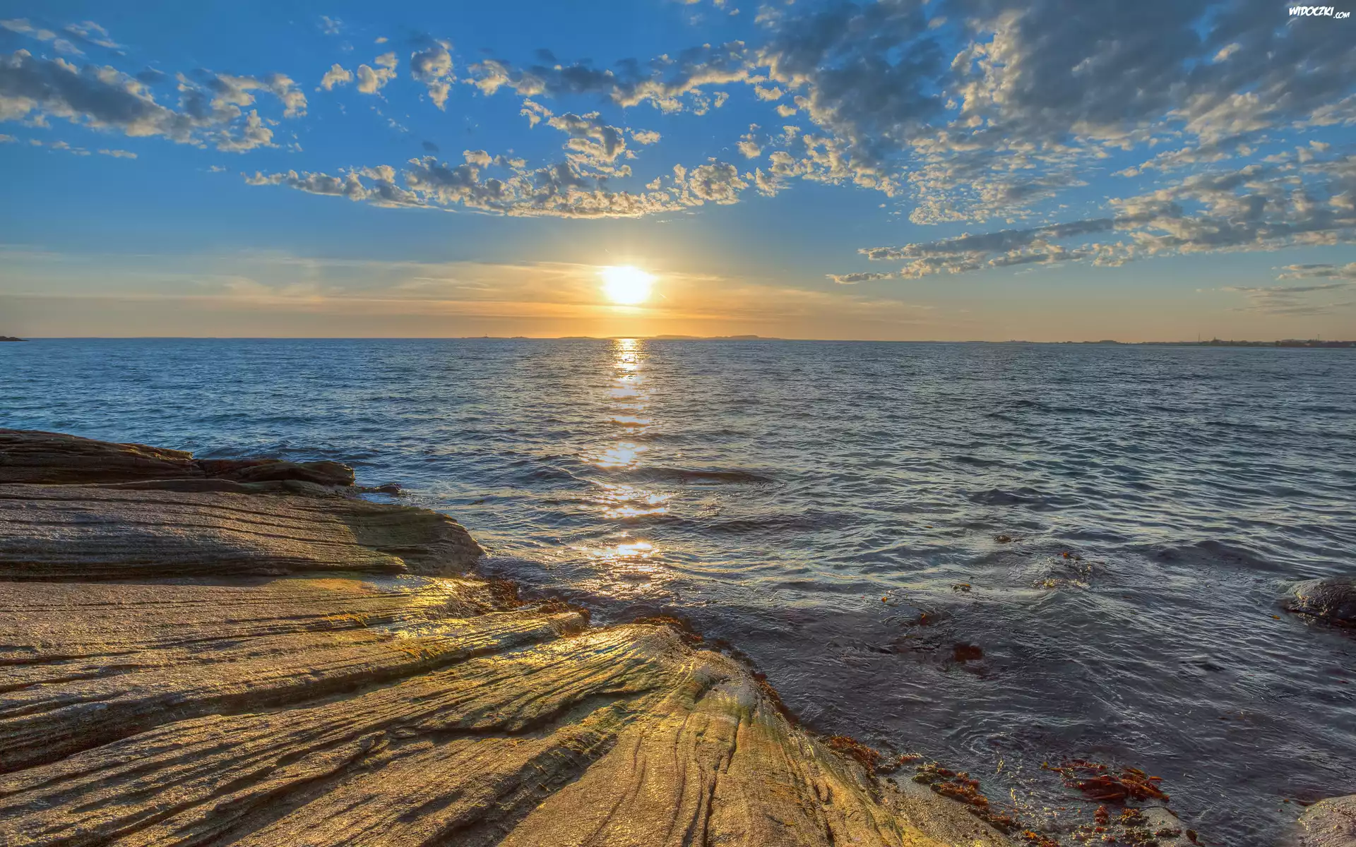Zdjęcia, Skały, Morze, Chmury, Niebo, Zachód słońca, Promienie