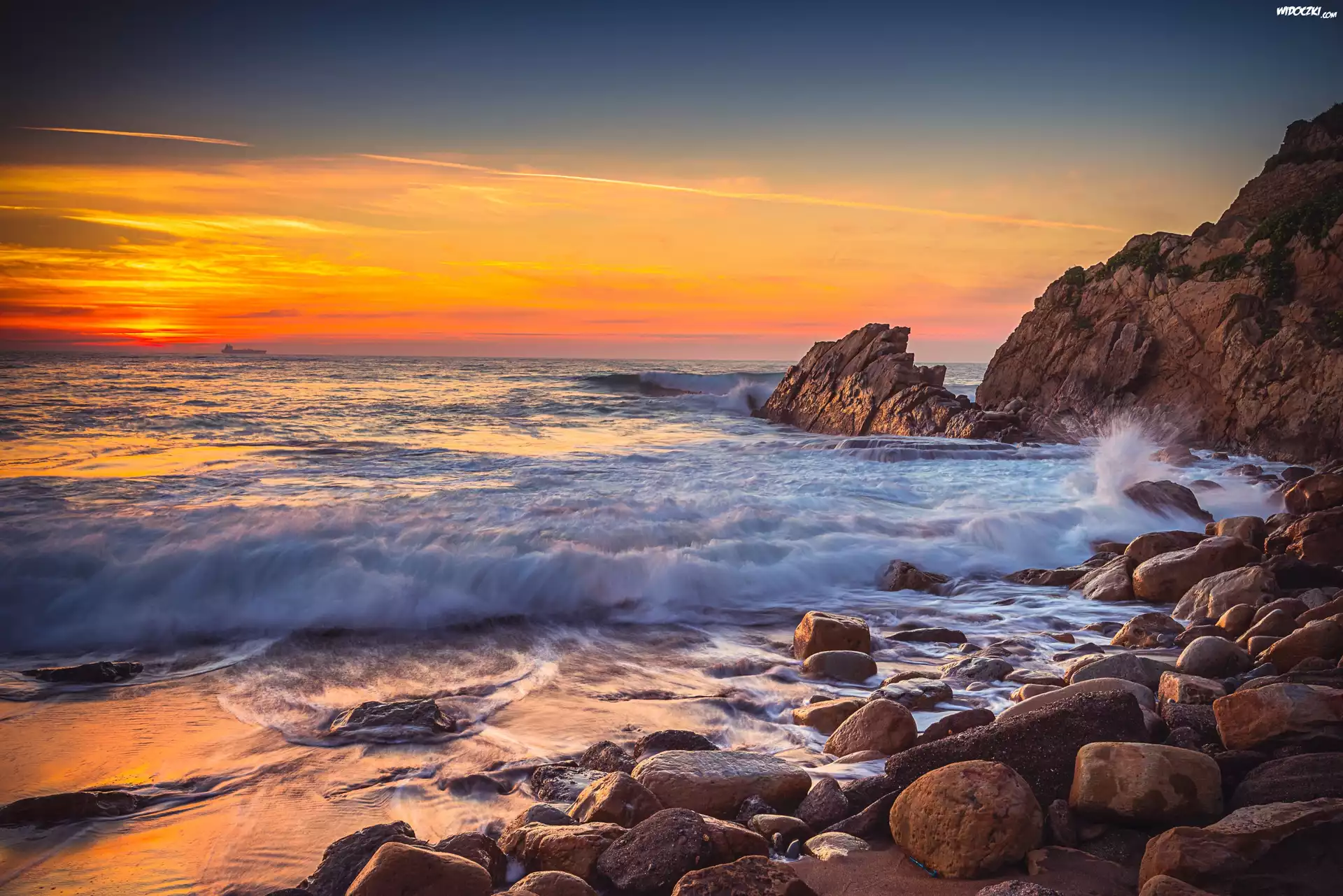 Zdjęcia, Morze, Zachód słońca, Skały, Kamienie