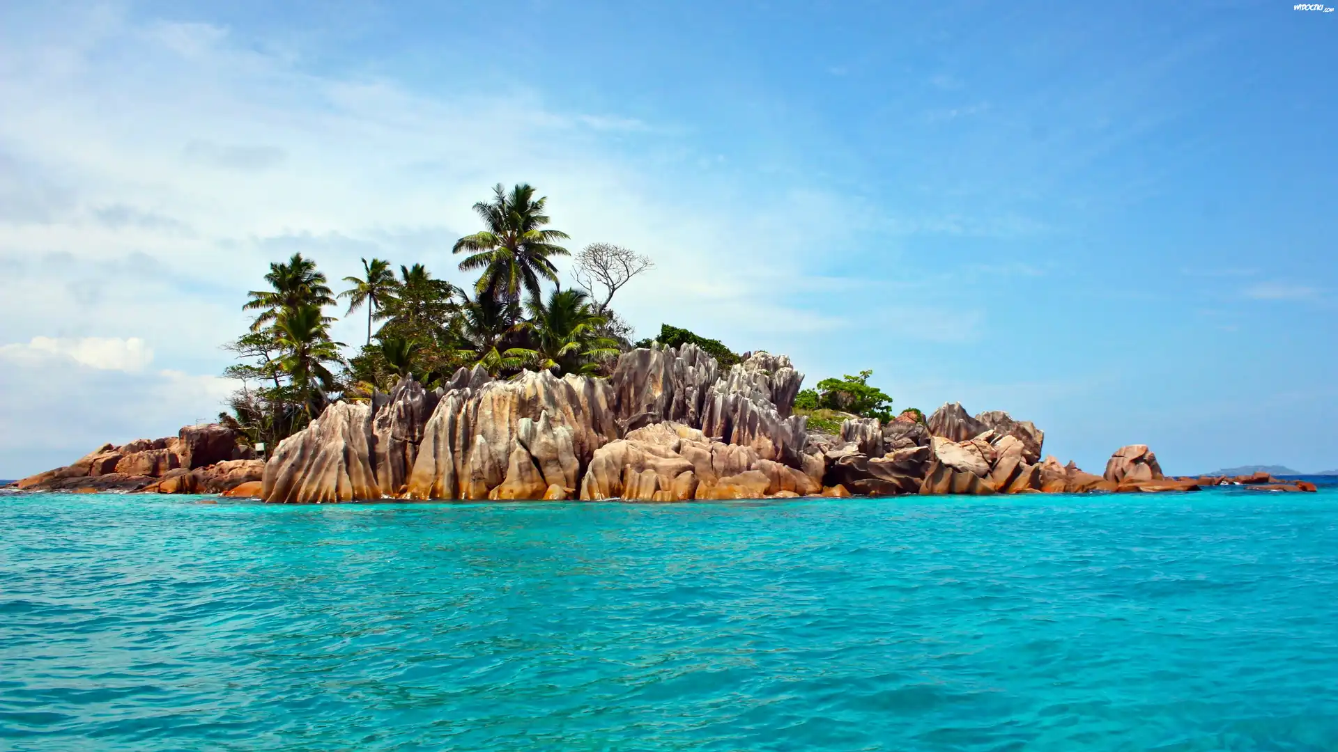 Zdjęcia, Morze, Fale, Wyspa, Skały, Palmy