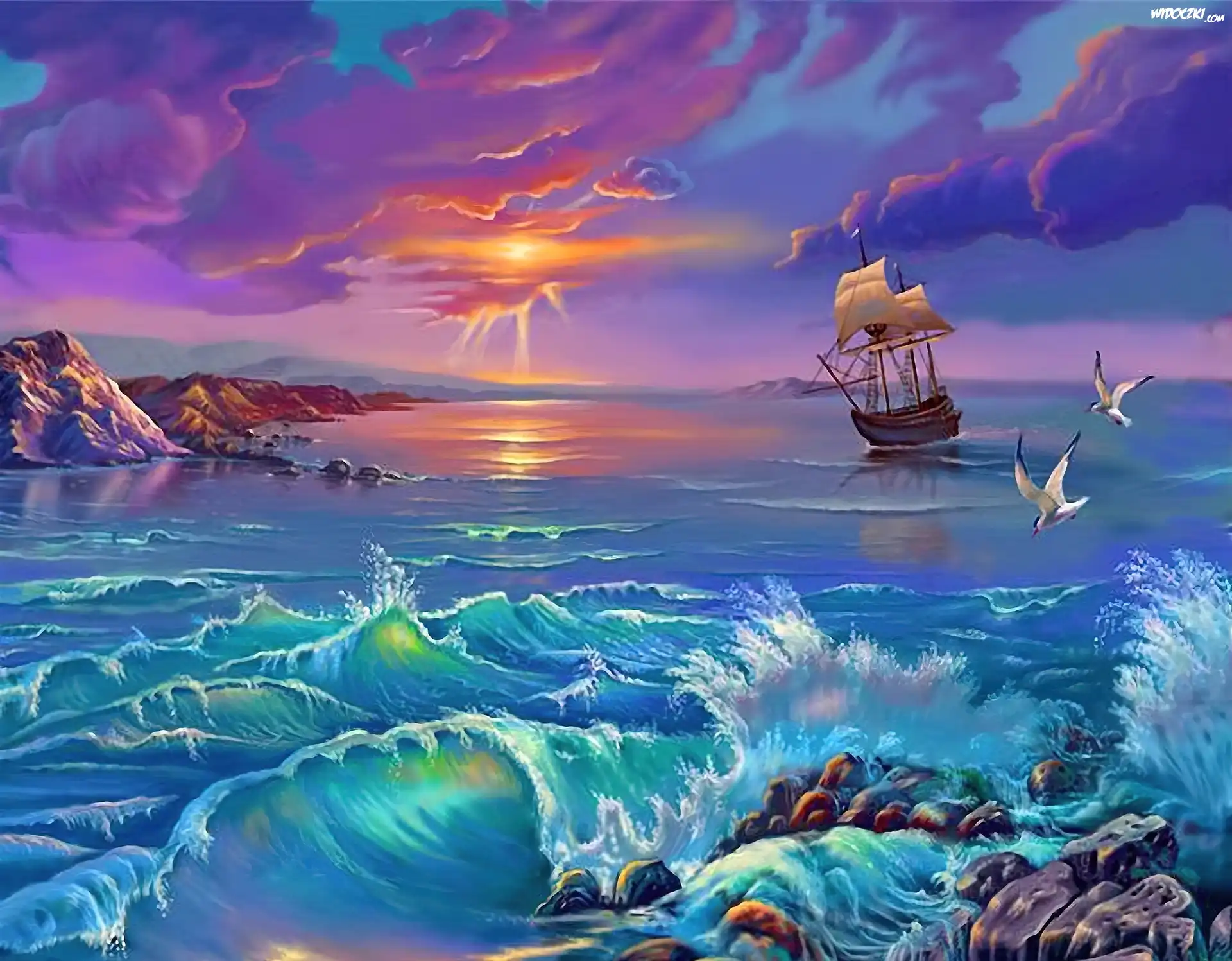Morze, Fale, Żaglowiec, Zachód, Słońca, Mewy