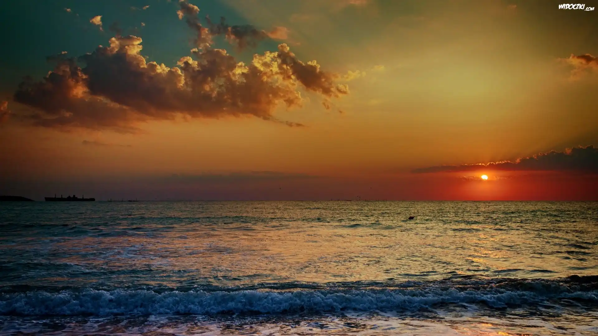Morze, Fale, Chmury, Zachód, Słońca, Statek